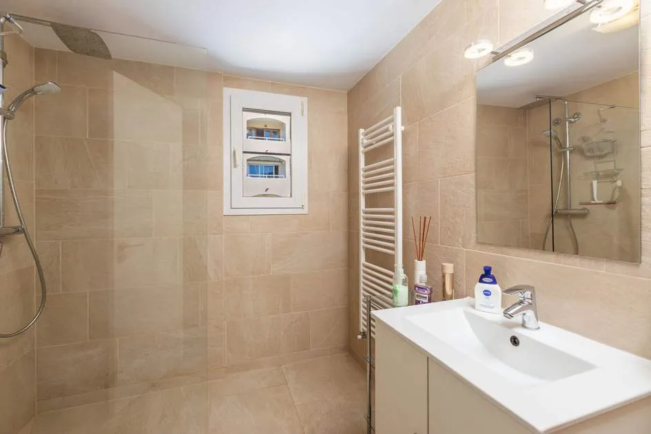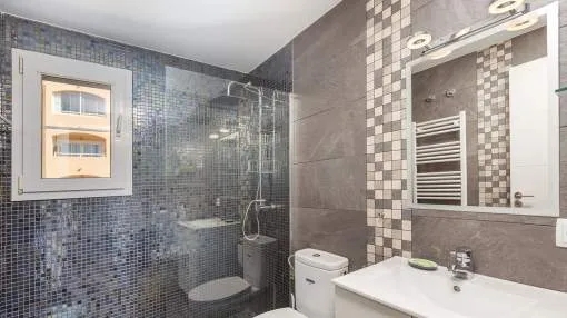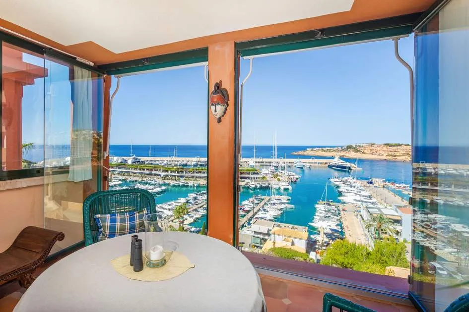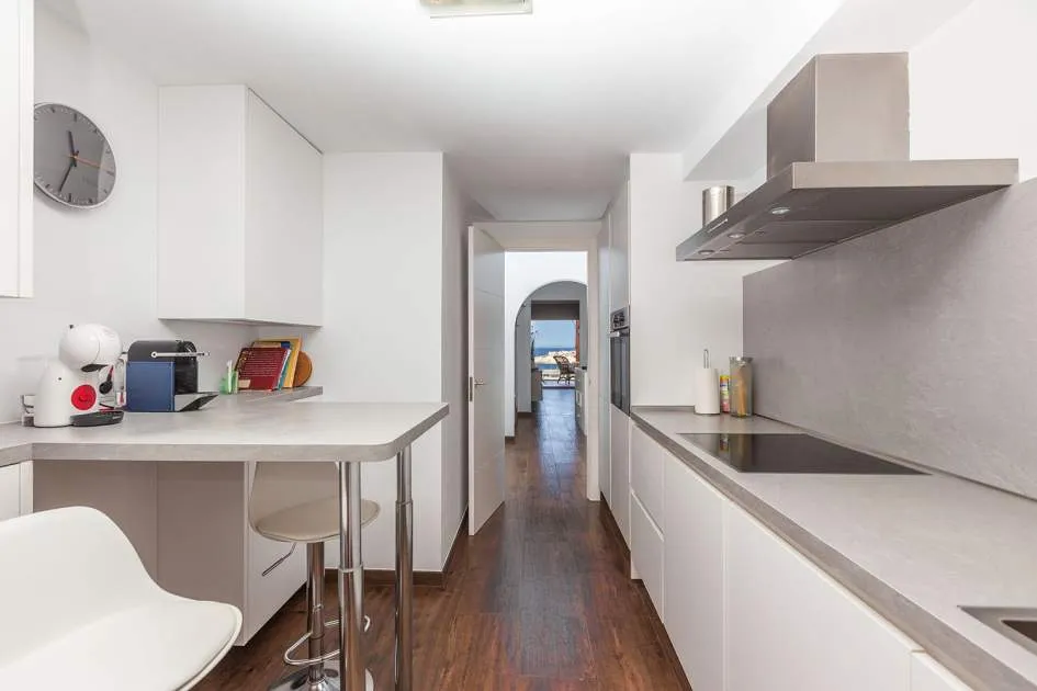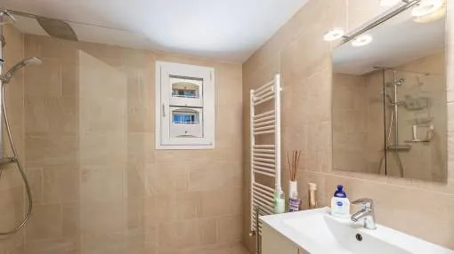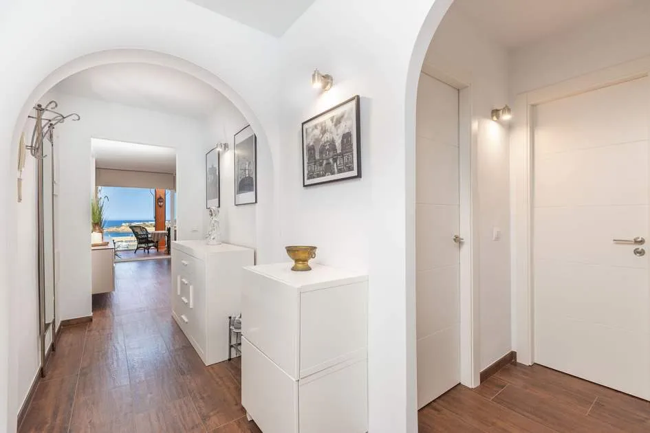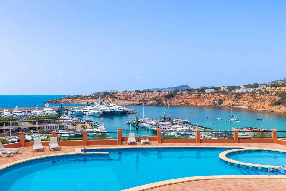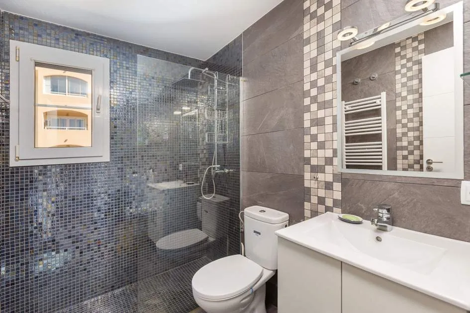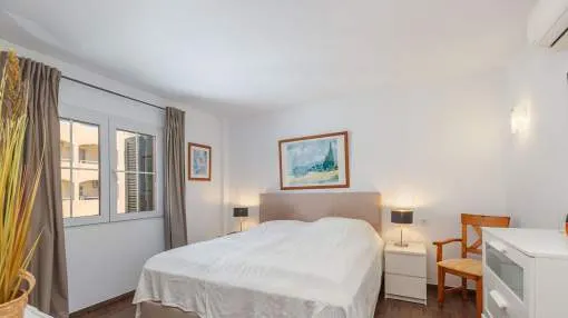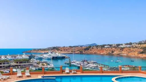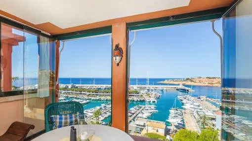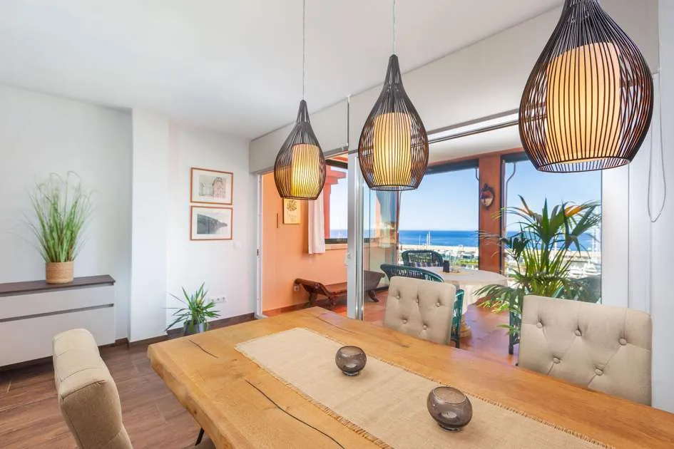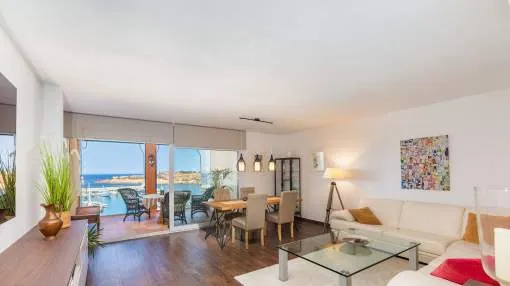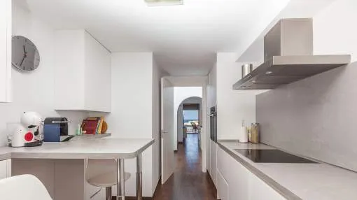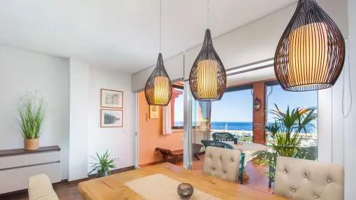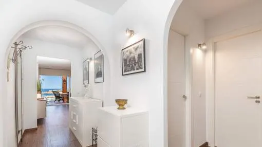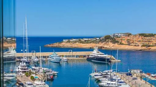 This exclusive penthouse is located on the top floor of a well-maintained Mediterranean complex in El Toro, right on the seafront above Port Adriano with its luxurious restaurants and designer boutiques. The sandy beach, shops and cafés are within walking distance, and the golf courses and Santa Ponsa are only a few minutes away. The complex has a beautiful garden, a sun terrace and a pool offering breathtaking sea views. The modernly renovated penthouse has underfloor heating, air conditioning and a fully equipped Miele kitchen. The spacious living-dining area opens onto a 15 m² covered terrace with full glazing. It can be used all year round and offers a magnificent panoramic view of the harbour and sea. The flexible glass elements and south-west orientation guarantee plenty of sun and a bright ambience. The rental price includes a parking space and a spacious cellar room in the underground car park.