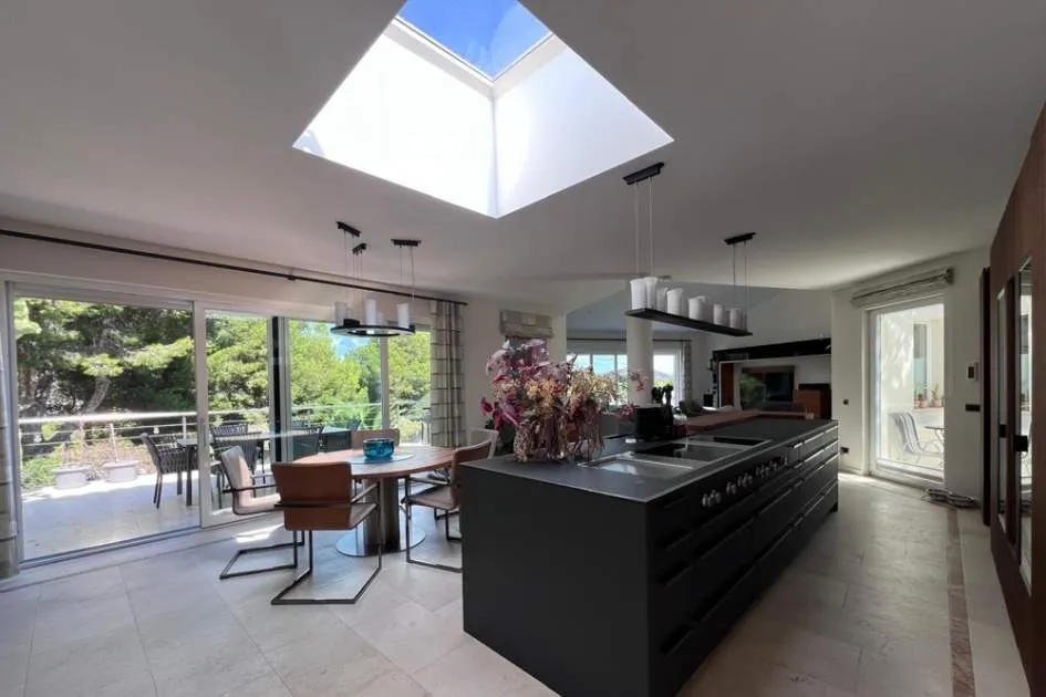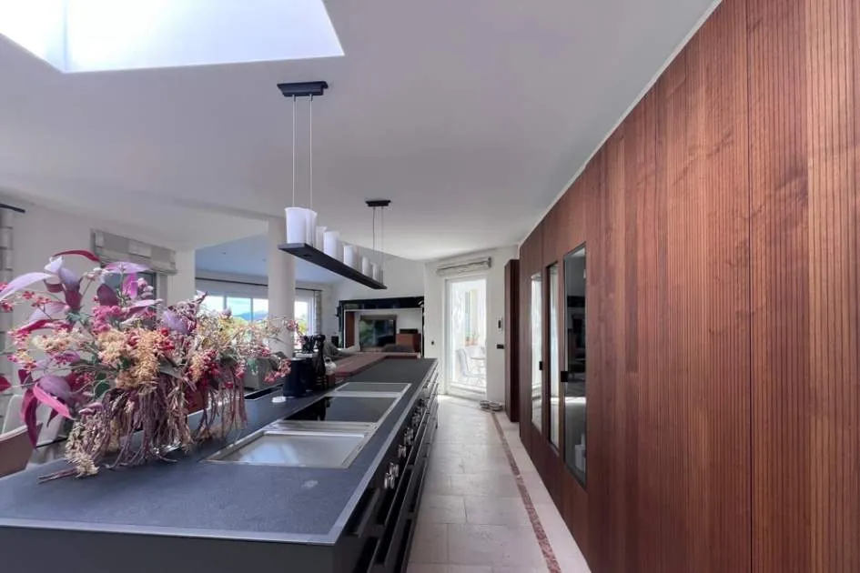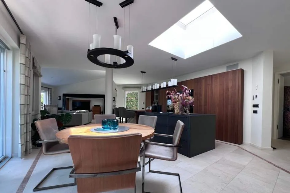 The property features open-plan living areas that ensure both space and privacy, along with a large terrace and balcony that connect with the outdoors, a private swimming pool surrounded by a well-maintained Mediterranean garden, and a heating/cooling system that guarantees maximum comfort throughout the year.
