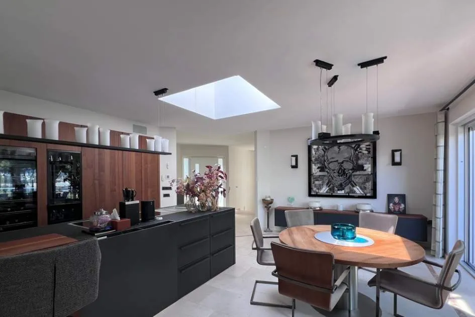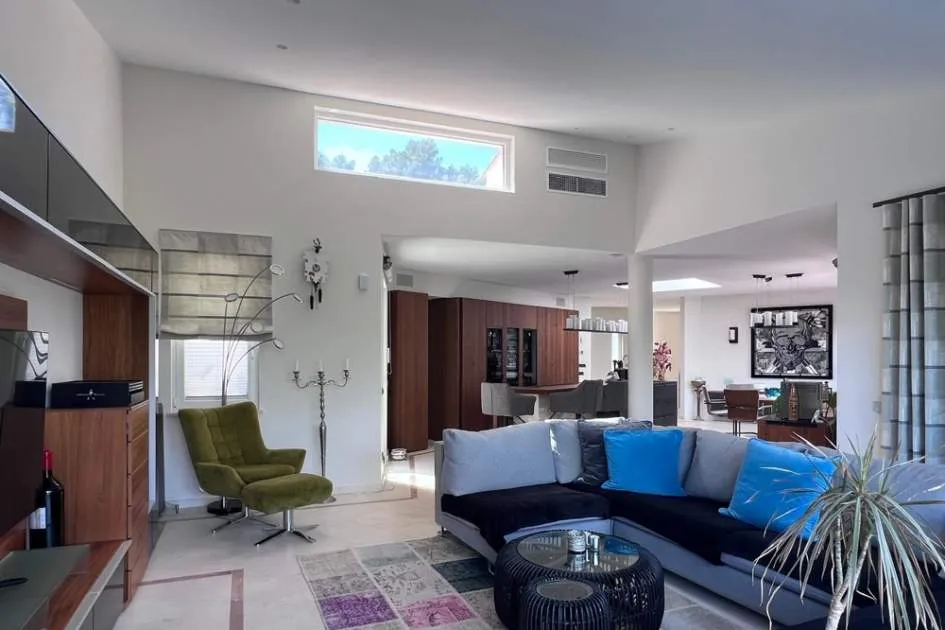 The villa is set on a generous plot of approximately 838 m² and offers an approximate living area of 352 m², characterized by bright spaces and double-glazed windows that create a cozy and energy-efficient atmosphere.