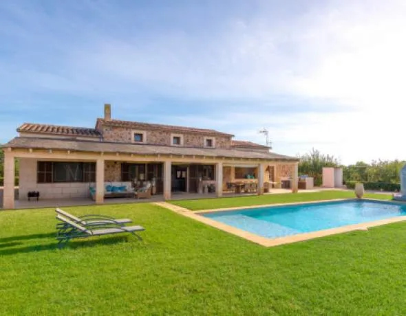 The finca with its light-flooded and spacious living/dining area with high ceilings and fireplace is entered via a decoratively designed entrance area. An open, fully equipped kitchen with cooking island leaves nothing to be desired and invites you to create Mediterranean dishes. A rustic solid wood table provides plenty of space for a large family and friends to eat and celebrate.