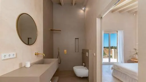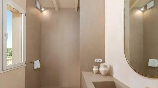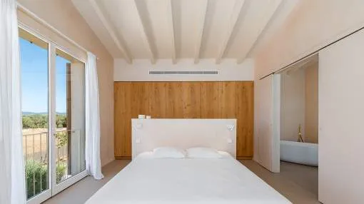 Details: This unique new-build finca is located between Campos and Sa Rapita in the Son Sorda area. Upon entering the finca, you immediately see and feel the high-quality materials and the attention to detail. The entrance area with the sliding gate made of solid wood invites you to see more. The house impresses with its high ceilings and care has been taken to ensure that plenty of light enters the property. There are 2 bedrooms on the left-hand side of the first floor, each with an en-suite bathroom. Each of these rooms has access to its own terrace. On the right-hand side, below the staircase to the upper floor, there is a small storage room and a guest WC has been installed next to it. The spacious entrance area leads into the open-plan living, cooking and dining area. Here, a fireplace invites you to spend cosy hours and all the furniture has been selected in simple natural colors. In combination with the micro-cement floors and the polished walls, this creates an enchanting symbiosis. Through the floor-to-ceiling windows you can enjoy a wonderful view of the lovingly landscaped garden and pool. The terraces are cozy and access is at ground level. A staircase leads to the upper floor. There are 2 further bedrooms here, including the master bedroom with an en suite bathroom. Both bedrooms have access to a large balcony with great views of the countryside. Further features include: - Saltwater pool with the option to heat or cool it - Underfloor heating via air/heat pump - technical room - Double garage - Solar and city electricity Arrange a viewing appointment with us and feel the positive energy of this property. Returns from holiday lettings: For initial orientation you can use the “Porta Holiday Returns Calculator” without obligation to calculate your potential returns from holiday letting. NB: Due to the current legal situation it is possible that in certain municipalities renting restrictions may apply, or new touristic licences may not be granted. Your Porta Mallorquina real estate consultant will be pleased to advise you whether the property you have chosen is affected. Go to Returns Calculator. Location & surrounding area: The rural town of Campos in the South-east of the island is conveniently situated halfway between Llucmajor and Santanyí. Surrounded by an extensive agricultural area, the town offers many shops for daily needs, restaurants and sporting facilities. There are only a few defence towers left of the old medieval town. Today Campos is a lively community, which especially on market days attracts many visitors. The famous, long sandy beach of Es Trenc with its dunes and turquoise blue sea belongs to the municipality of Campos and offers beach fun with Caribean flair. The airport can be reached in 25 minutes, the island capital Palma is only 35 km away.