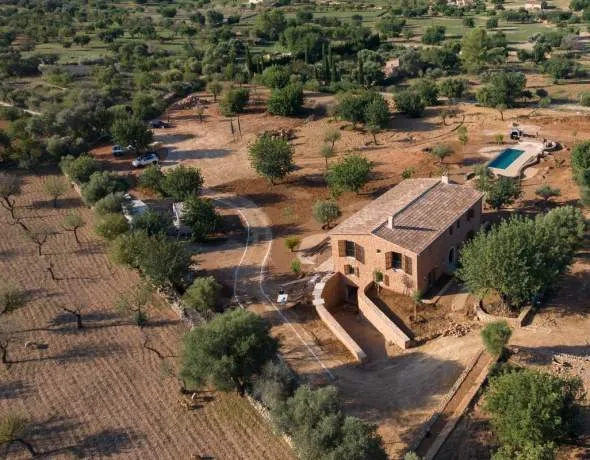 Situated in the heart of Mallorca, Alaró, this new estate is a testament to the timeless allure of Majorcan architecture, harmonising tradition with modern living. The project sprawls across a vast land area of more than 16,000 m2, blending rustic charm with contemporary elegance. Throughout the entire house, beautiful wooden beams extend from the ceiling, creating a rustic and charming atmosphere. The rooms and bedrooms are designed with a simple yet elegant character, adorned in natural hues. Large windows illuminate the spaces, seamlessly merging the interior with the surrounding nature, providing a remarkable connection to the outdoors. The extraordinary spiral staircase gracefully connects the ground floor to the upper level.