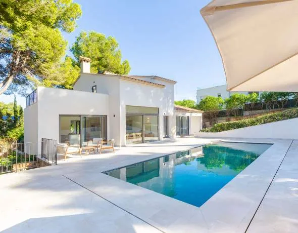 The villa, which underwent a comprehensive refurbishment in 2025, now presents itself as a high-end property that meets the most modern standards in all construction and design details. It is situated in an exclusive and tranquil residential area of villas between the renowned Santa Ponsa golf courses and the coast. Two marinas, several beautiful bays and extensive beaches, as well as a wide range of leisure and sports facilities, can be reached within a few minutes. The lively town center with a well-developed infrastructure is also within a short drive. The island’s capital, Palma, is about 20 kilometers away and offers quick access to cultural attractions, shopping opportunities and the international airport.