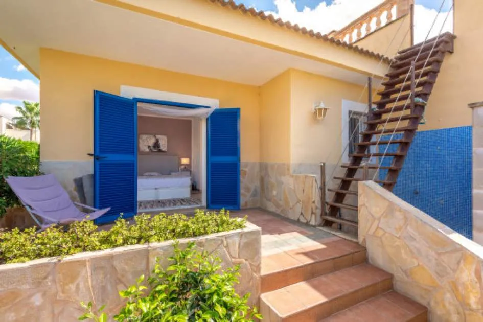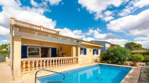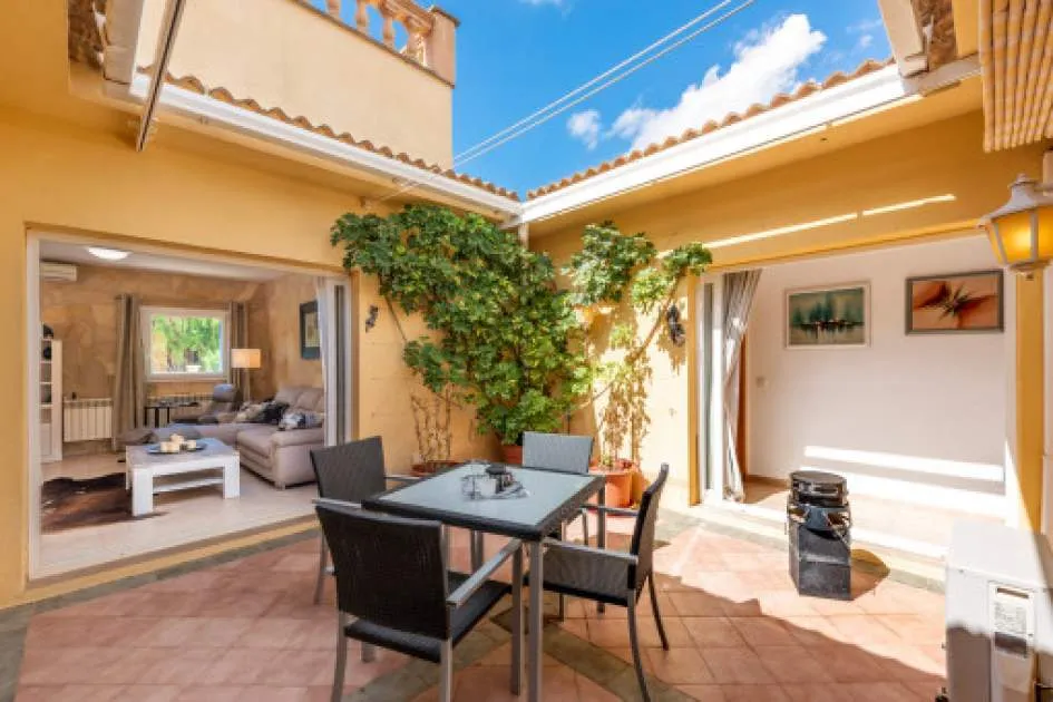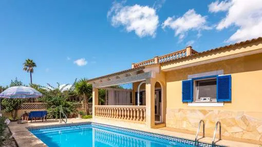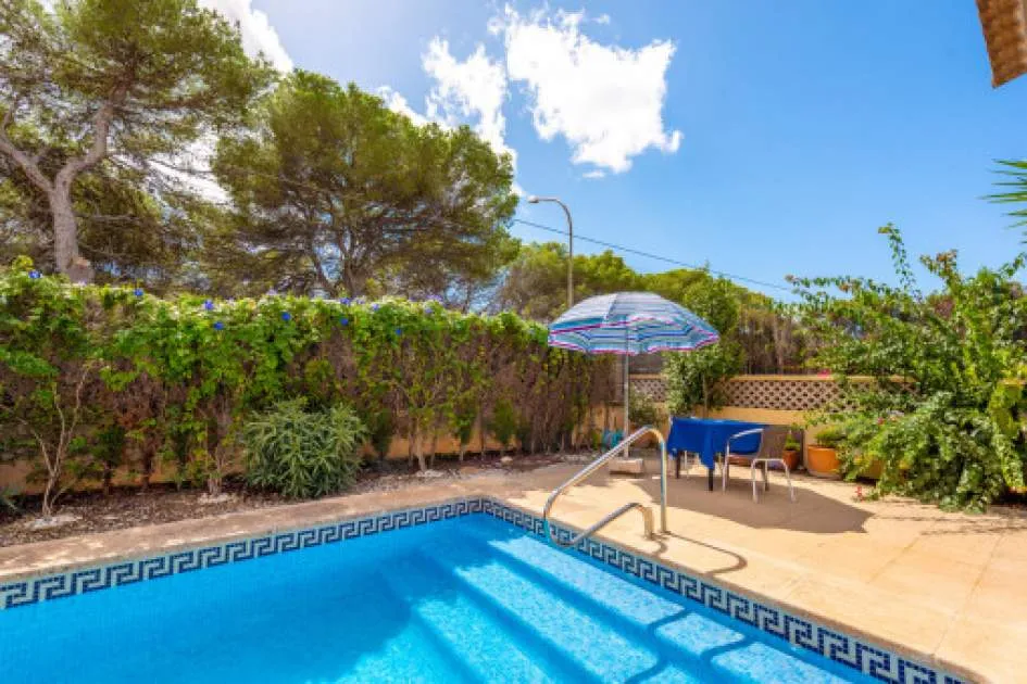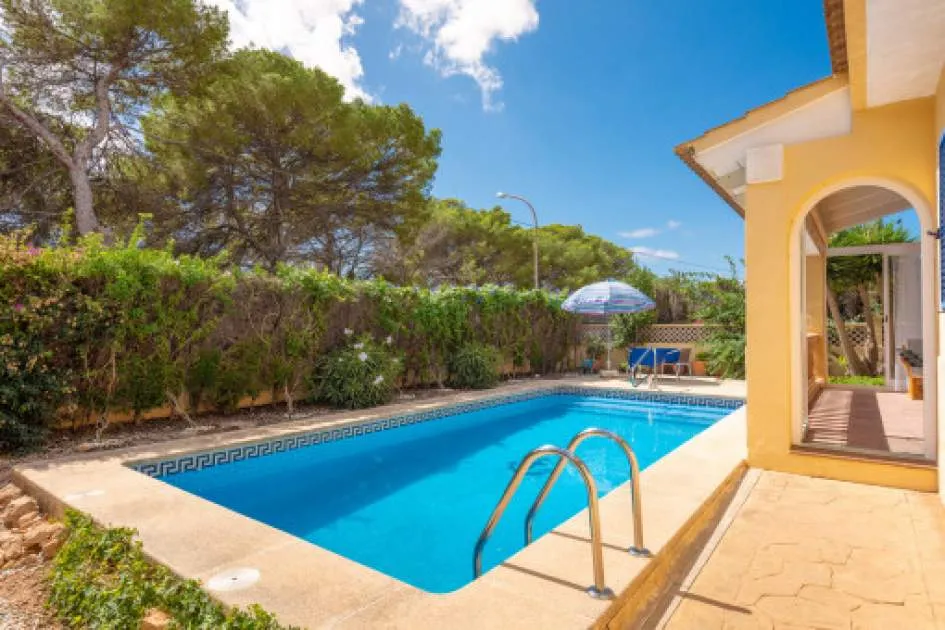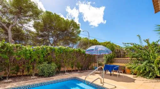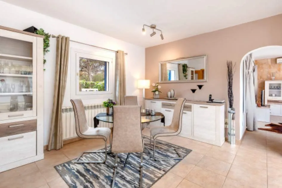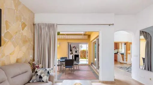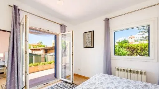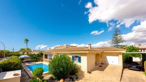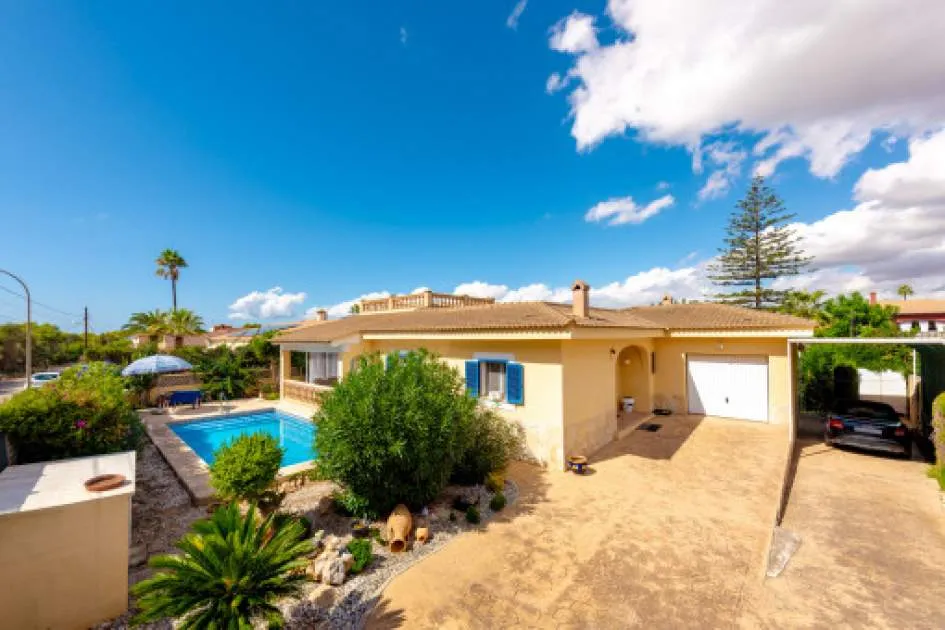 Details: This charming single-storey villa sits on a 600 sqm plot in an exceptionally quiet residential area and impresses with its high-quality construction built to German standards. With a living space of approximately 212 sqm all on one level, the property offers maximum comfort and, thanks to its barrier-free design, is also perfectly suited for wheelchair users. The villa features 3 bedrooms and 2 modern shower bathrooms, one of them en suite. The cozy living room with direct access to the veranda creates a warm and inviting atmosphere, complemented by a separate dining area. The bright kitchen is fully equipped with branded appliances and is connected to a convenient laundry room. A special highlight is the spacious 5 x 5 m patio with a retractable awning and custom-made PVC double-glass doors. All doors can be fully retracted into the wall, ensuring excellent ventilation while providing complete privacy. The outdoor area is designed for relaxation and enjoyment: a covered veranda, which can also be used in winter, leads directly to the private swimming pool (8 x 4.5 m) with outdoor shower and sun terrace. The well-maintained garden with lemon trees, ornamental plants, and two storage rooms adds to the Mediterranean charm. A carport for two vehicles is available, and the entire property is securely fenced. Additional features include central butane gas heating, air conditioning (warm/cold), ceiling fans, numerous built-in wardrobes, and PVC windows with double glazing and mosquito screens. Electricity (Gesa), municipal water supply, internet connection, and satellite dish are all in place. The energy certificate is currently being processed. In excellent condition, this property offers privacy, comfort, and quality, making it an ideal home to enjoy the Mediterranean lifestyle to the fullest. Returns from holiday lettings: For initial orientation you can use the “Porta Holiday Returns Calculator” without obligation to calculate your potential returns from holiday letting. NB: Due to the current legal situation it is possible that in certain municipalities renting restrictions may apply, or new touristic licences may not be granted. Your Porta Mallorquina real estate consultant will be pleased to advise you whether the property you have chosen is affected. Go to Returns Calculator. Location & surrounding area: The new urbanisation Bahia Grande is situated in south-coast and belongs to the prefered residential area due to its calm and close neighbourhood to Palma. The village Llucmayor, the marina of Arenal and the two golf courses Son Antem I and II can be reached in 20 minutes by car. In this area the prices for properties are still moderate in comparison with other areas.
