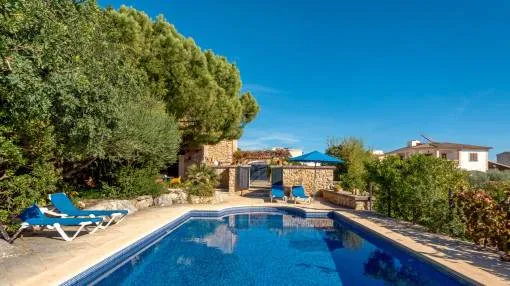 Details: This fantastic duplex apartment is located on its own end plot in a small, well-kept residential complex with a total of 14 apartments, which was completed in 2019. An electrically operated entrance portal with intercom system provides a spectacular view of the communal grounds, which are overgrown with large plants typical of the island. The pool area, surrounded by tall palm trees, is slightly elevated. The property is accessed via a few steps that lead to the modern 14 sqm entrance area, which also serves as a covered terrace. The first floor consists of a fully furnished living/dining area, which radiates cosiness thanks to its natural stone wall. In winter, the pellet stove provides pleasant warmth. The open-plan kitchen with cooking island (Nolte brand) is equipped with Siemens appliances, a washing machine (Miele brand) and a side-by-side refrigerator. A guest WC with towel radiator and a small storage room under the stairs add to the comfort of this living level. From the kitchen, you have access to the lovingly planted, approx. 200 m² garden with its tasteful teak outdoor furniture under an electrically operated awning. An outdoor shower and a Biohort hut provide additional amenities. An opaque fence and a lockable gate ensure privacy in this property. On the second floor there are 2 bright double bedrooms with generous fitted wardrobes and natural stone walls as well as a spacious bathroom with walk-in shower and natural stone shelves. One of these rooms has access to a 14 sqm balcony with views of the pool area and the large palm trees. The entire residential complex and each residential unit is fenced off with high-quality stone walls. A private parking space at the front of the property is included in the total price. Location & surrounding area: Santanyí in the southeast of Mallorca is among the most popular villages of the island and has resisted over centuries Romans, Arabs and pirates. The beautiful small city with its golden façade of sandstone is elevated from the green surrounding and attracts tourists as well as residents on Wednesdays and Saturdays to the colourful weekly market. Around the Plaza Mayor, there are various cafés and restaurants offering a broad culinary selection. The surrounding narrow streets with beautiful shops invite you to stroll. The natural preserve of Mondragó is nearby offering numerous routes for hikers, whereas the idyllic bays at the east coast, as Cala Santanyí or Cala Llombarts are perfect for bathing. The harbour of Portocolom and the golf course of Vall d’Or are at a short distance