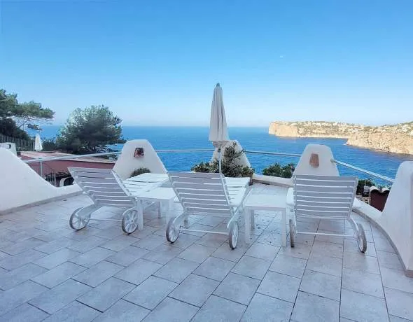 This first-floor apartment, which is decorated in an authentic Mediterranean style, is located in the picturesque bay of Cala Llamp, right next to Port Andratx. Characteristic terracotta flooring and exposed wooden beams give the property a warm elegance and timeless appeal. Port Andratx is renowned for its upscale marina and promenade lined with restaurants, cafés, and boutiques.