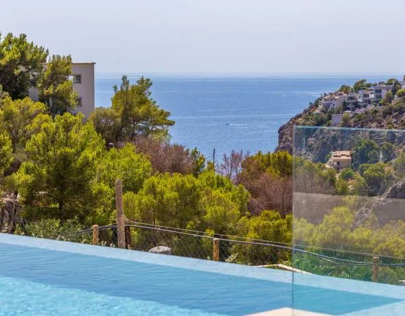 This exceptional villa is located in the highly sought-after area of Cala Llamp, a stone bay nestled between the beaches of Camp de Mar and Cala Blanca. This small bay, boasts crystal-clear waters and offers an unparalleled natural environment and complete privacy. Built in 2024, the property extends over three main floors and an additional floor, with a total built area of 548 m² on a generous plot of 1,066 m². Its south-west orientation guarantees an abundance of light throughout the day and spectacular sunsets. Its elevated position offers panoramic views of the Mediterranean Sea and the impressive mountain landscape of the surrounding area. The house has air conditioning and underfloor heating throughout, complemented by elegant natural stone flooring. In terms of smart home technology, the property boasts a comprehensive home automation system that allows for the automated control of a variety of home functions. Solar panels and a private cistern ensure the property is sustainable and has a reliable water supply. Structural features include double-glazed security windows for optimal heat and sound insulation, high-quality natural stone surfaces, and an efficient layout utilising the space across several floors. This property offers a unique opportunity to acquire a newly built home in one of the most exclusive areas on the Andratx coast.