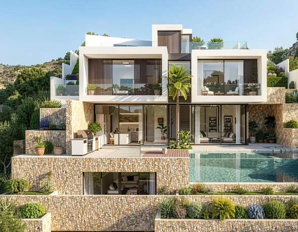 This building plot is situated in a spectacular location above Cala Llamp, is only a few minutes’ walk from the popular beach club and offers sensational views of the sea and the coast. The golf course in Camp de Mar and the picturesque harbour of Port Andratx with its numerous restaurants, bars and boutiques are within easy reach. The exclusive plot can be built on with a villa with swimming pool in accordance with the building regulations of the municipality of Andratx. There is an authorized building project for the plot, which is included in the price. The 660 sqm constructed area includes spacious living areas, four bedroom-suites, a spa and fitness area, a pool, and a roof terrace. The interior will include a designer kitchen, elegantly appointed bathrooms, a lift, and state-of-the-art building services. An underground car park will also be built on the lowest level.