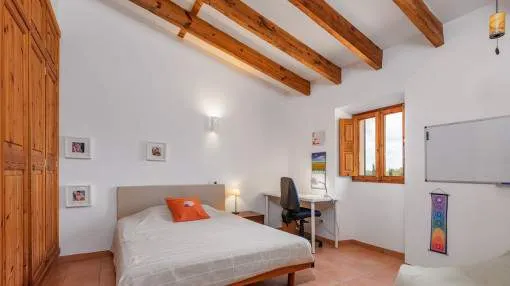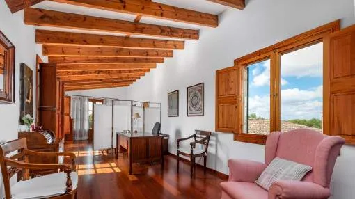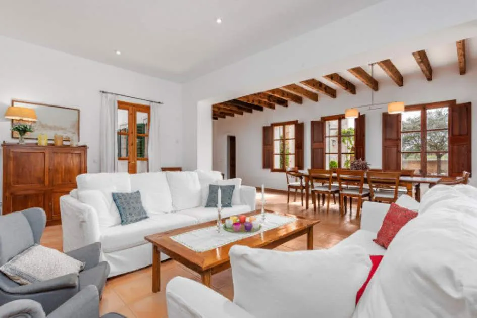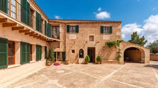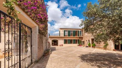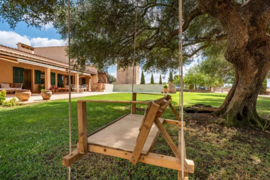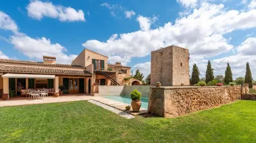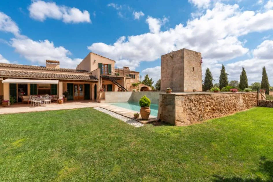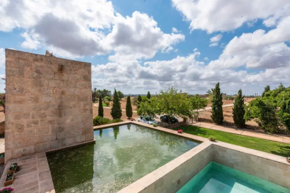 Details: This beautifully restored country estate, originally built in 1890, has been brought back to life with great attention to detail and the finest materials. A part of the original structure has been carefully preserved, combining traditional Mallorcan charm with modern living comfort. Set on an extensive plot of approx. 19,770 m², the property includes the elegant main house, a fully functional windmill, a historic water basin, and a modern swimming pool that adds an architectural contrast while maintaining perfect harmony with the surroundings. Upon entering this light-filled finca, the generous layout immediately catches the eye. The property offers four bedrooms, one of them with an en-suite bathroom. The warm contrast between the honey-coloured wooden beams and the white walls creates an elegant and welcoming atmosphere. The ground floor features a bright entrance hall, a cosy and functional kitchen with access to the breakfast terrace, a spacious living and dining area, one bedroom, a laundry room and a garage. On the upper floor you will find additional bedrooms, an office, and a larger room that could serve as a workspace or studio. The well-maintained Mediterranean garden with mature trees and multiple sunny and shaded terraces invites you to relax and enjoy the peace of the countryside. This exclusive finca is ideal for those seeking a stylish home in a serene setting. Location & surrounding area: The rural town of Campos in the South-east of the island is conveniently situated halfway between Llucmajor and Santanyí. Surrounded by an extensive agricultural area, the town offers many shops for daily needs, restaurants and sporting facilities. There are only a few defence towers left of the old medieval town. Today Campos is a lively community, which especially on market days attracts many visitors. The famous, long sandy beach of Es Trenc with its dunes and turquoise blue sea belongs to the municipality of Campos and offers beach fun with Caribean flair. The airport can be reached in 25 minutes, the island capital Palma is only 35 km away.