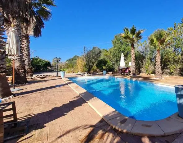 The estate provides ample storage areas, several carefully designed relaxation zones, a section of land ideal for cultivation, and a large swimming pool with bar surrounded by palm trees, plus a built-in barbecue area.