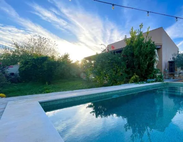 This beautiful country house is idyllically located outside Llubí and combines modern comfort with rustic charm. The house has just been freshly renovated, while the original features such as high ceilings (living area) with wooden beams, stone walls, small windows, and atmospheric lamps have been lovingly preserved – creating a cozy, authentic living experience.