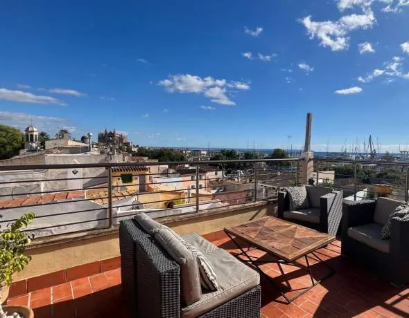 Spread over two levels, it offers 60 m² of interior space and two wonderful terraces: a 13 m² terrace adjacent to the kitchen and a 38 m² rooftop terrace with open views of the Cathedral, the sea and the rooftops of Palma.