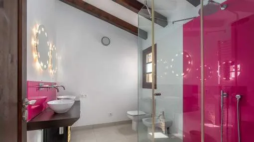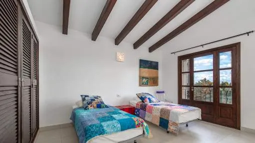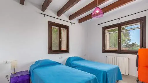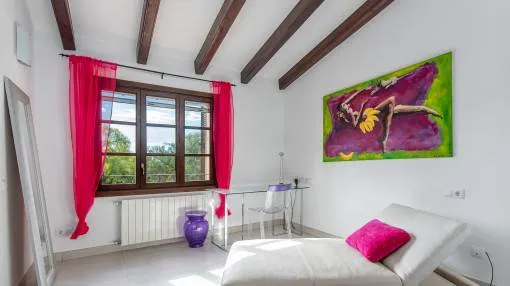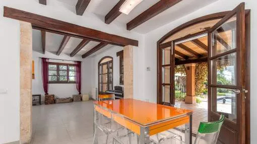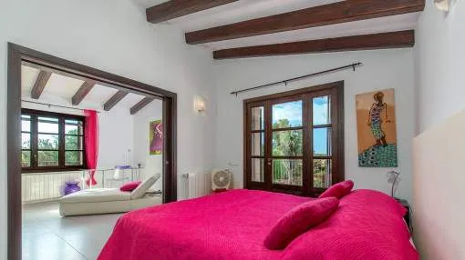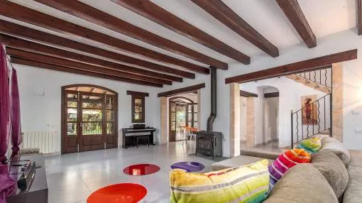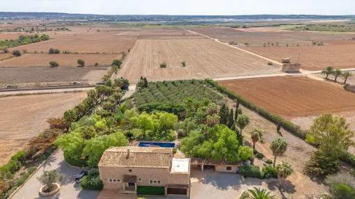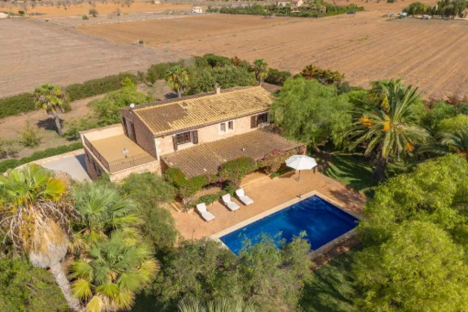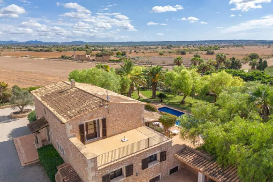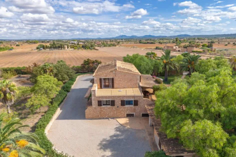 Details: This charming finca with Mediterranean flair is centrally located, just a few minutes from the beautiful natural beach of Es Trenc. A retreat full of peace, privacy and Mediterranean joie de vivre awaits you here. A picturesque driveway, lined with palm trees, leads you directly to the finca, which impresses from the outside with its traditional natural stone façade. On the first floor, you are greeted by an inviting entrance area, which leads into the spacious, open-plan living and dining area with fireplace. Exposed wooden beams lend the room authentic charm and underline the Mediterranean ambience. Like the living area, the separate, fully equipped kitchen offers direct access to the covered terrace. From here, you can enjoy a wonderful view of the lovingly planted garden, which invites you to spend relaxing hours outdoors. There are also 2 bedrooms, a bathroom and a utility room with guest WC on this level. On the upper floor there are 3 further bedrooms and 2 bathrooms, one of which is en suite. The spacious master bedroom boasts its own bathroom, a cozy chill-out area and a private terrace with beautiful views. The outdoor area presents itself as a true oasis of well-being: lush Mediterranean plants, palm trees and a small olive plantation for your own olive oil create a paradisiacal ambience. Several terraces, an inviting pool and a barbecue area offer ideal places to relax and socialize. This finca is the perfect place for anyone who wants to experience authentic Mallorca and enjoy the Mediterranean lifestyle at its best. Returns from holiday lettings: For initial orientation you can use the “Porta Holiday Returns Calculator” without obligation to calculate your potential returns from holiday letting. NB: Due to the current legal situation it is possible that in certain municipalities renting restrictions may apply, or new touristic licences may not be granted. Your Porta Mallorquina real estate consultant will be pleased to advise you whether the property you have chosen is affected. Go to Returns Calculator. Location & surrounding area: The rural town of Campos in the South-east of the island is conveniently situated halfway between Llucmajor and Santanyí. Surrounded by an extensive agricultural area, the town offers many shops for daily needs, restaurants and sporting facilities. There are only a few defence towers left of the old medieval town. Today Campos is a lively community, which especially on market days attracts many visitors. The famous, long sandy beach of Es Trenc with its dunes and turquoise blue sea belongs to the municipality of Campos and offers beach fun with Caribean flair. The airport can be reached in 25 minutes, the island capital Palma is only 35 km away.