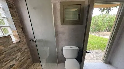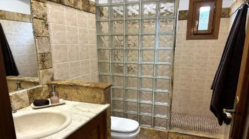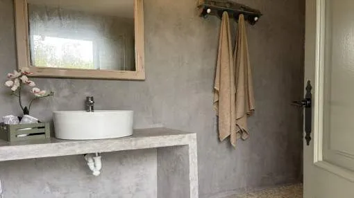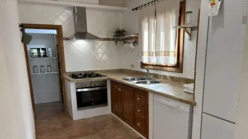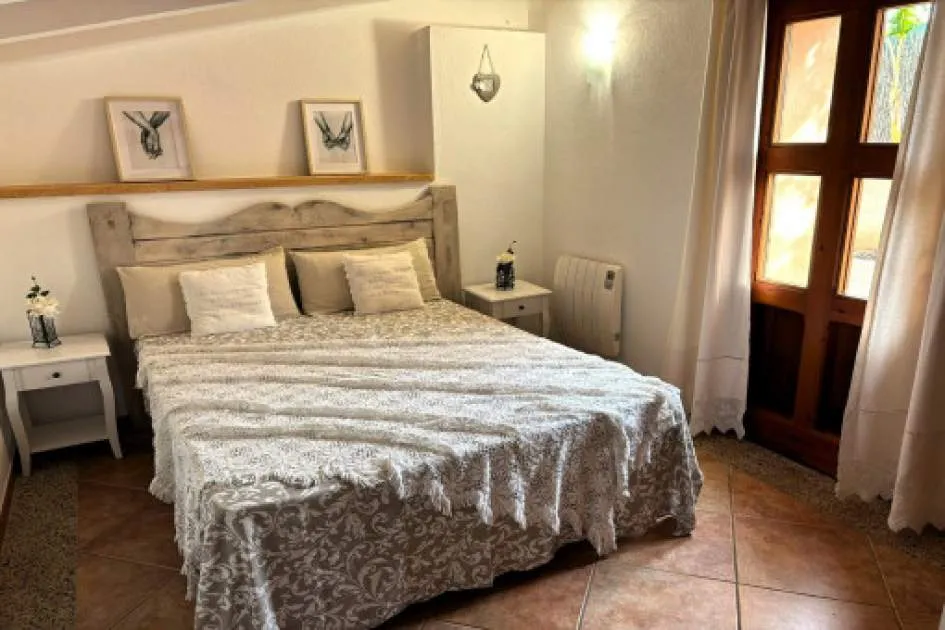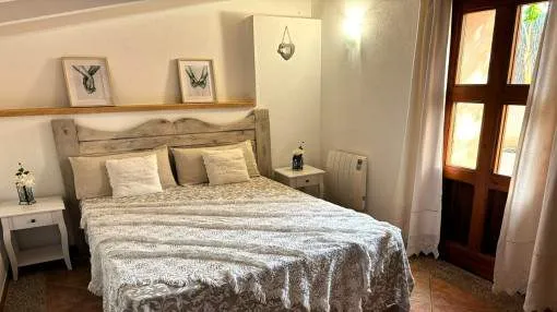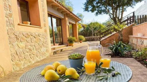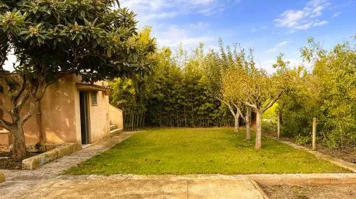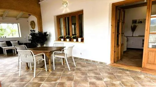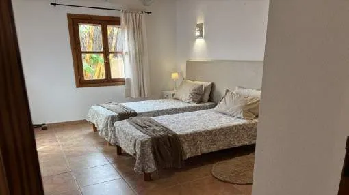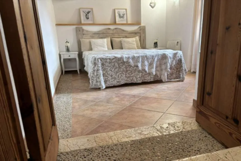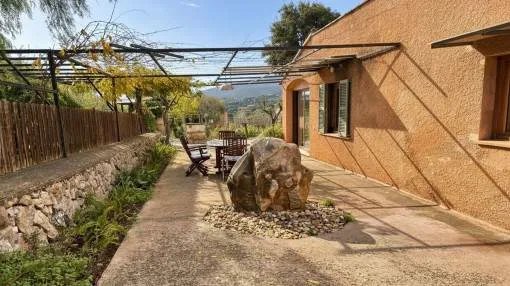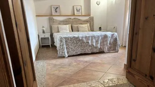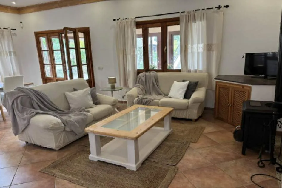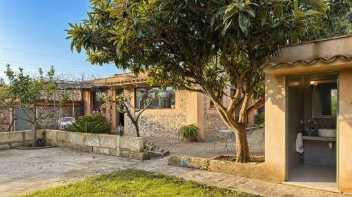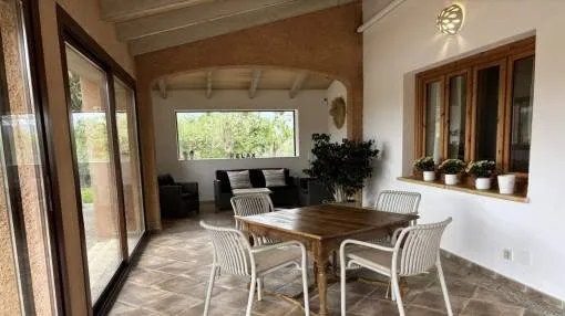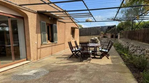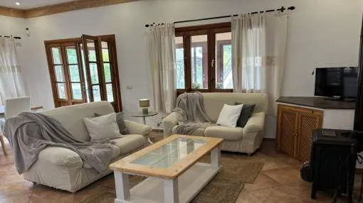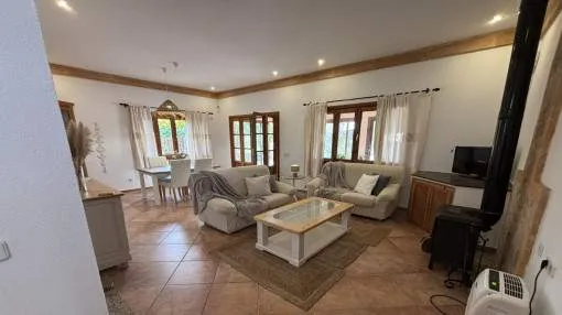 Details: This charming finca is available for long-term rent and is situated in a quiet setting near Sant Llorenç des Cardassar. The property offers approximately 140 sqm of constructed area and sits on a plot of around 735 sqm with fruit trees that give the surroundings a distinctly Mediterranean character. Inside, you will find a spacious living and dining area, a kitchen with pantry, and an entrance area that can ideally be used as an office or additional workspace. A fully glazed winter garden extends the living area, bringing in plenty of natural light and creating a warm and inviting atmosphere. The well-maintained furnishings further enhance the welcoming character of the home. A separate laundry room is also available. The finca features two bedrooms, one of them with a separate entrance, as well as two bathrooms, including one located directly by the pool. Outdoors, several terraces around the house, a pool of about 15 sqm, and a traditional stone oven offer ideal spaces to enjoy the Mallorcan lifestyle. Terracotta floors, a fireplace and air conditioning ensure a pleasant living climate. A notable feature are the traditional pebble mosaic floors, which add an authentic yet subtle Mallorcan touch to the property. Location & surrounding area: