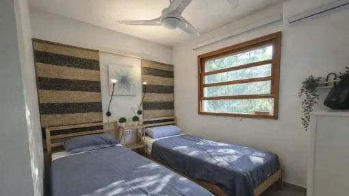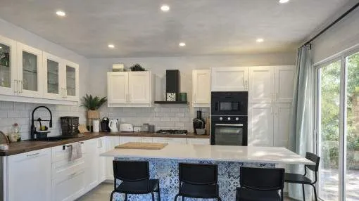 Details: This cozy holiday home is located in the idyllic coastal area of Cala Llombards, a small and quiet village on the southeast coast of Mallorca. The town is known for its relaxed atmosphere, traditional architecture, and proximity to stunning sandy coves. The nearby town of Santanyí, with its lively weekly market, boutiques, and restaurants, is just a few minutes by car. The beautiful sandy beach of Cala Llombards is only about 800 meters away on foot, perfect for relaxing days by the sea. The semi-detached house is all on one level and offers 113 sqm of comfortable living space. It features two bedrooms and two small bathrooms with showers. The spacious living area is open-plan and includes an American-style kitchen, allowing cooking, dining, and relaxing to flow seamlessly together. The outdoor area is a real highlight: a large covered terrace with a barbecue and a spacious pool invites you to unwind. The garden is fenced and tastefully designed, with plenty of seating and sun loungers for beautiful vacation days in Mallorca. The house is available for monthly rental. Prices depend on the season and rental duration. For inquiries and individual rental requests, please contact us. Prices for monthly seasonal rentals monthpriceJanuary€ 1,300.- February€ 1,300.- March€ 1,600.- April€ 1,800.- May€ 2,000.- June€ 2,300.- July€ 3,000.- August€ 3,000.- September€ 2,500.- October€ 2,500.- November€ 2,000.- December€ 1,600.- Location & surrounding area: The picturesque Cala Llombards is situated in the south of Majorca, close to Santanyí and the village of Llombards. You will also find the beaches Mondragó and Figuera very close, whereas Cala Llombards is the quietest of them, and one of the most beautiful beaches of the island. The village breathes peaceful tranquillity. To reach Santanyí you need about 5 minutes, there are the best shopping possibilities.