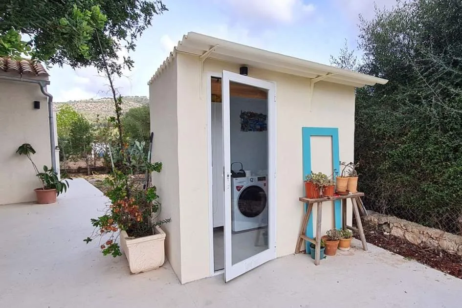 Outside, there is an independent utility room used as a laundry area with an additional toilet. The plot also contains an old water tank that can be refurbished, along with a functional 13,000-litre water tank supplying the house. Electricity is provided by solar panels with battery storage of up to 5 kW, complemented by a gas generator. The property also benefits from a brand-new septic tank with a water recycling system for irrigation.