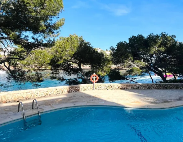 This charming seafront ground-floor apartment is located in Cala d'Or, a few steps from Cala Ferrera, and features an open-plan dining, living, and kitchen area, 2 bedrooms, and 2 full bathrooms. It offers a private garden, as well as access to communal areas including a seafront pool with stunning views, landscaped gardens, and direct access to the sea. The property is rented fully furnished and also includes air conditioning and communal parking.