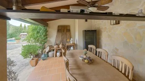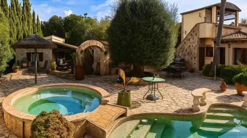 Details: In the green heart of rural Pollensa, just a few minutes from Pollensa golf course and the charming old town, you will find this fantastic, single-storey finca on a plot of just under 4,000 m². The property, which was completely renovated in 2010, offers a constructed area of around 350 m², distributed over a main house, a separate guest house, a double garage and a small gardener's cottage. The main house comprises two spacious double bedrooms, both with en-suite bathrooms, an open-plan living and dining area with access to the terrace as well as a comfortable kitchen and a utility room. Typical Mallorcan elements such as terracotta tiles and high ceilings with wooden beams give the house its unmistakable charm. Double glazing, air conditioning, a fireplace and underfloor heating via an air heat pump also ensure modern living comfort all year round. The separate guest house has a double bedroom, a spacious bathroom in a timeless style and a small kitchenette. Here too, double glazing and underfloor heating ensure pleasant comfort all year round. A special highlight of this property is the heated pool with an area of around 60 m² and integrated jacuzzi area. There is a further bathroom next to the pool. The outdoor area impresses with well-tended green areas, mature trees, a barbecue area with a wood-burning oven and a high degree of privacy. A roof terrace with bar, which is accessible from the outside, offers wonderful views of the Tramuntana and the surrounding Pollensa countryside. The finca has an old vacation rental license for 6 people and therefore also represents an interesting investment opportunity. It is also connected to the public electricity grid and has its own registered well. Parts of the finca are protected and can be legalized under the current amnesty law. Returns from holiday lettings: For initial orientation you can use the “Porta Holiday Returns Calculator” without obligation to calculate your potential returns from holiday letting. NB: Due to the current legal situation it is possible that in certain municipalities renting restrictions may apply, or new touristic licences may not be granted. Your Porta Mallorquina real estate consultant will be pleased to advise you whether the property you have chosen is affected. Go to Returns Calculator. Location & surrounding area: Pollensa, known by insiders as the "second capital" of the island, emanates a very special, even princely charisma. At the northern foothills of the Tramuntana mountain range, this romantic town offers a mountain panorama around the mountain Puig de Maria, which is the hallmark of this region. A rich, especially musical cultural activity offering and unique top real estate records, such as along the Calvario (Calvary) in the centre, or the peaceful classy residential district of La Font on the mountainside, and a stunningly beautiful rural setting on the adjacent valleys Vall d' en March, Vall D' Colonya and Vall D' Aixartell give this spot an incomparable charm. There is many a gem on offer which, along with a modern infrastructure is ideal for the perfect vacation property. Also for lovers of the traditional Majorcan town house, Pollensa is just the place - there are lots of properties to discover which have either already been completely renovated, or still have enough space for extra development.