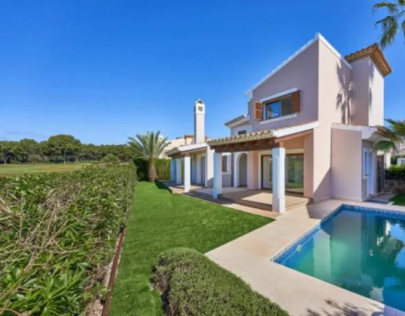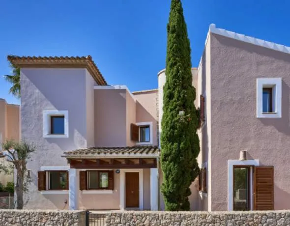 With a constructed interior area of 215.78 sqm, the house offers a spacious living and dining area with exposed wooden beams and a fireplace, an open, fully equipped kitchen, and 3 bedrooms – one of them on the ground floor with an en-suite bathroom and walk-in wardrobe. On the upper floor there are two further bedrooms, each with its own bathroom, as well as a sunny terrace with views over the golf course.