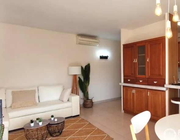 This well-appointed top-floor apartment offers a practical and spacious layout just a 3-minute walk from the beach. The interior features three bedrooms and two bathrooms, providing ample space for a family or guests. The main living area is bright and functional, opening directly onto a covered terrace that offers a shaded outdoor retreat for dining or relaxing throughout the day.