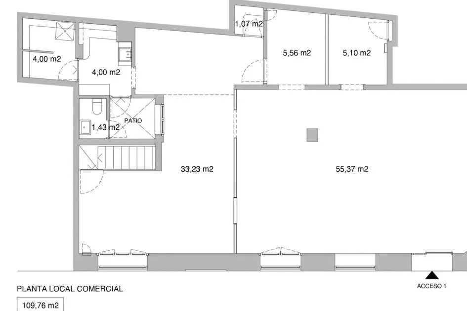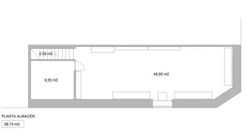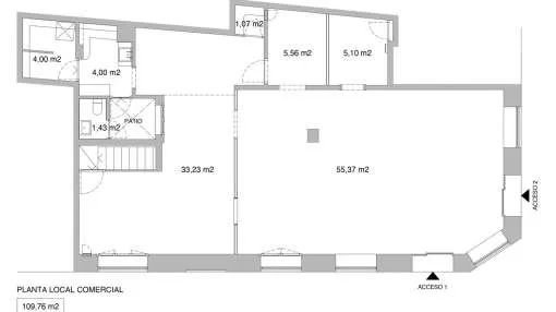 Commercial property of 168.5 m² (109.76 m² main space + 58.74 m² basement) in Llucmajor, located on a corner next to Plaza Espanya, with a busy pedestrian street and a side street with vehicle access, with entrances from both streets.