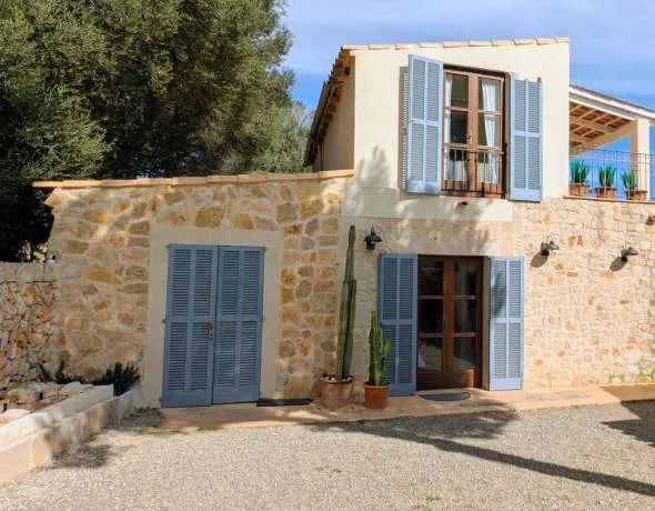 On the upper floor, there is another bedroom with its own private bathroom and walk-in shower, as well as a large terrace offering stunning views over Santanyí and the surrounding nature.