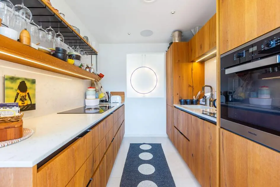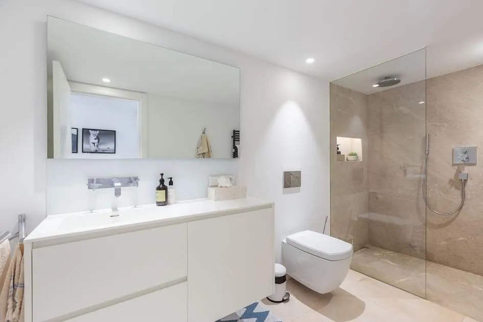 The upper floor comprises a bright living room with a dining area and a semi-open kitchen, as well as a spacious terrace with harbour views. Three bedrooms, two bathrooms, a guest WC and a utility room complete the property.