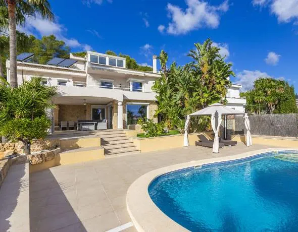 This tastefully furnished villa is located in a sought-after tranquil residential area just outside Palma. The refurbished house is situated in an elevated position on a slightly inclined, low-maintenance plot and enjoys fantastic sea and panorama views. The main living area on the first floor is divided into a living/dining room with fireplace and access to the spacious covered terrace, a modern kitchen, one en suite bedroom. a guest toilet, a utility room and storeroom. On the next level there is the master bedroom with bathroom and a large, partially covered terrace with great views, plus another bedroom and a bathroom. The top floor accommodates a bright bedroom with beautiful views. Outside the property features inviting terraces with swimming pool and outdoor shower as well as a double car port.
