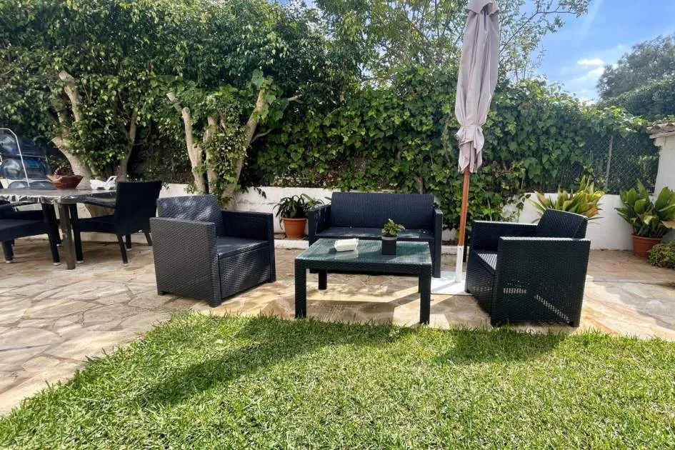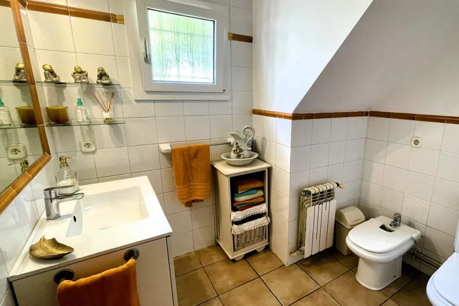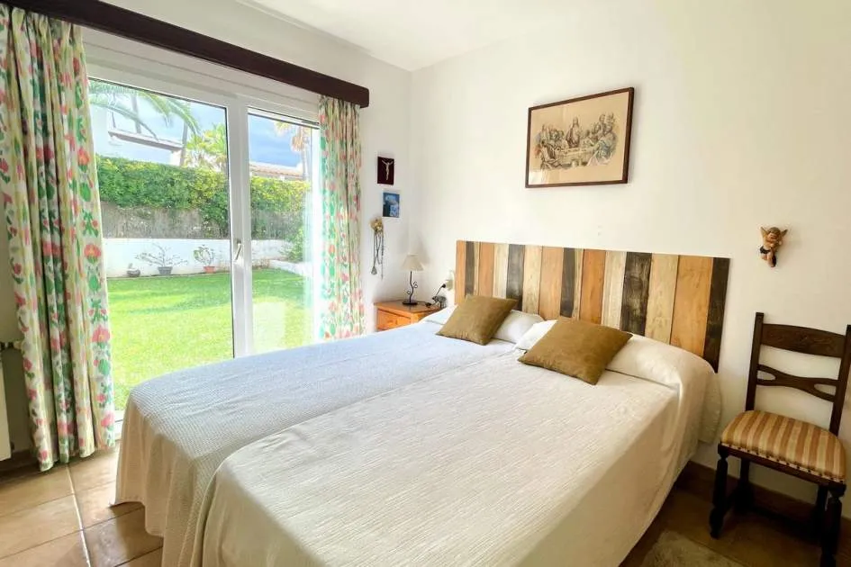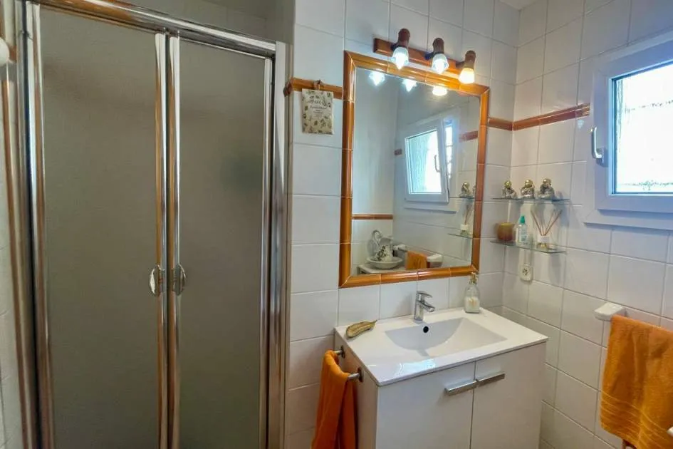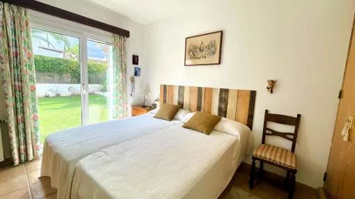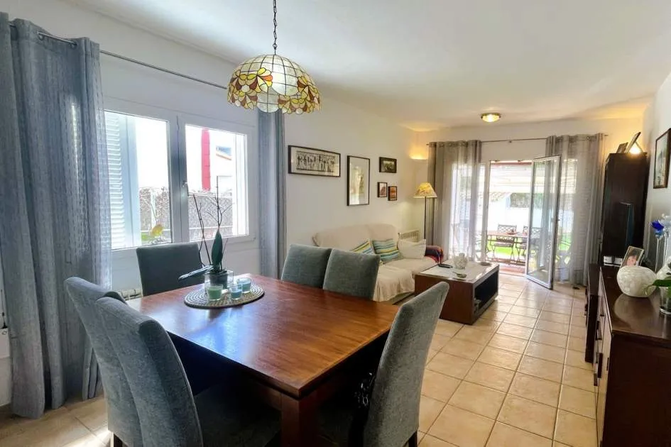 The ground floor features a spacious living and dining area with seamless access to the garden, a large bedroom also opening onto the outdoor space, a big bathroom with shower, and a fully equipped separate kitchen.