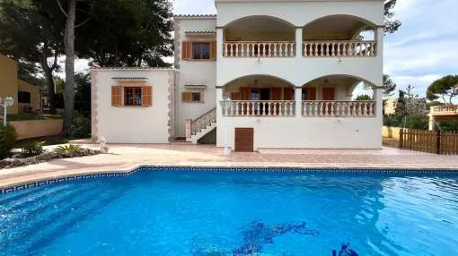 Details: This exclusive villa is located in Son Vida, Palma’s most sought-after luxury district, renowned for its stunning villas, world-class golf courses, and breathtaking views. Situated at the highest point of Son Vida, the property offers panoramic views over Palma, extending all the way to the sea. From the spacious terraces and infinity pool, you can overlook the city—especially in the evening, when Palma’s twinkling lights create an unforgettable atmosphere. Seamlessly integrated into the hillside, the villa's entrance is on the upper floor. This level features 2 guest toilets, a spacious kitchen, an elegant dining area, a grand living room, and 2 bedrooms, each with an en-suite bathroom. Additionally, there is a separate staff apartment with its own entrance. The lower level impresses with an open yet cozy living area featuring a fireplace, a generous lounge space, a stylish library, a second dining area, and 3 more bedrooms, each with its own en-suite bathroom. Exceptional craftsmanship is showcased throughout the villa, with surfaces finished using the rare Italian plastering technique "Stucco Veneziano." Another highlight is the exquisite marble, which extends across all floors and dramatically enhances the freestanding, grand spiral staircase. On the lowest level, you will find the pool area with a barbecue space and a third terrace. Behind it, a spacious technical room, a fully equipped summer kitchen, 2 guest toilets, and ample space for a sauna or fitness room are discreetly tucked away. Returns from holiday lettings: For initial orientation you can use the “Porta Holiday Returns Calculator” without obligation to calculate your potential returns from holiday letting. NB: Due to the current legal situation it is possible that in certain municipalities renting restrictions may apply, or new touristic licences may not be granted. Your Porta Mallorquina real estate consultant will be pleased to advise you whether the property you have chosen is affected. Go to Returns Calculator. Location & surrounding area: The well-known villa urbanization of Son Vida is situated only a few minutes away from the center of Palma. Nestled in idyllic, rolling landscape at the foot of the Tramuntana mountain range it provides fantastic views over the bay of Palma and the open sea. Its numerous designer-villas will inspire lovers of architecture, and all properties stand on ample-sized plots of land so that the privacy of each is assured. Added to that the 24-hour security service at the entrance to Son Vida preserves the security of the cosmopolitan residents. Thanks to the excellent traffic connections the airport is less than half an hour's drive away, although absolute tranquility is enjoyed on site. Additionally, Son Vida offers numerous sport and leisure activities, particularly for golfers. A total of four golf courses (Golf Son Vida, Golf Son Muntaner, Golf Son Quint and Golf Son Quint Pitch & Putt) stretch over the extensive terrain and incorporate themselves picturesquely into the surrounding nature. The center of Palma with its exquisite bars, restaurants and shopping possibilities can also be speedily reached and offers cultural and culinary variety the whole year. Families with school-age children will also feel comfortable in Son Vida. In 2017 the Green Valley Private School was opened and guarantees outstanding education for its pupils. For exquisite accommodation there are two 5-star hotels on site. The Sheraton Mallorca Arabella Golf offers traditional country-house charm, and the Castillo Hotel Son Vida is a modernized castle originating from the 13th century and offers an extensive range of services and classic ambience. From the hotel terrace there are spectacular views of Palma and its surroundings. Son Vida also has a very good selection of restaurants which, in part, belong to the hotels described above. Why not just come by and be convinced by Son Vida's radiance?