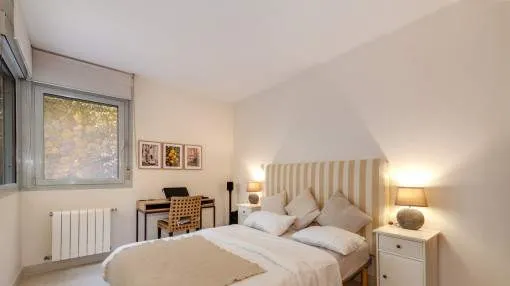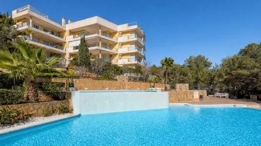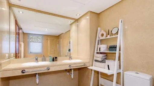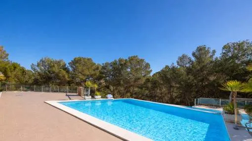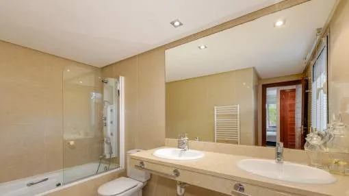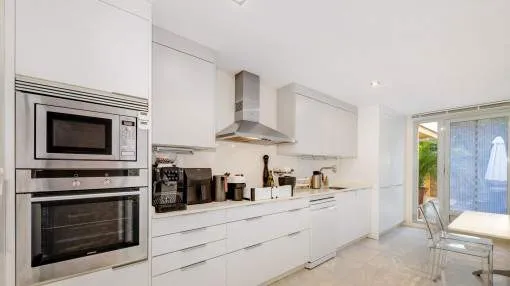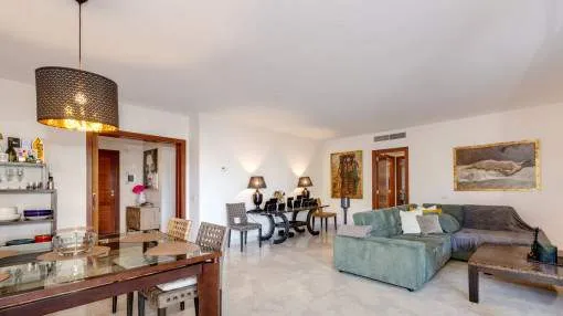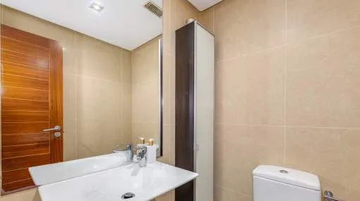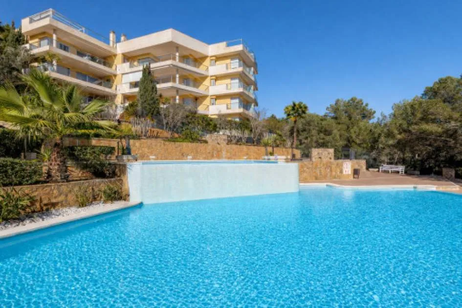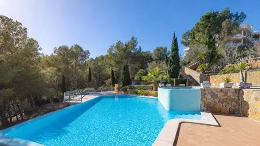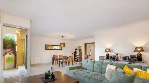 Details: This high-quality first floor apartment is located in Sol de Mallorca, a sought-after residential area not far from the idyllic bays of Caló de sa Nostra Dona and Cala de Portals Vells. It is located in a well-kept residential complex with a communal pool and a padel court and offers a successful combination of comfort, privacy and modern facilities. With a living area of approx. 190 sqm, a spacious terrace of 53 sqm and a private garden of 415 sqm, the apartment offers an ideal living concept. High-quality materials and an elegant design underline the exclusive character of the property. The entrance area leads into the modern kitchen, which offers direct access to the rear terrace and garden. There is also a practical storage room for garden utensils. The spacious and bright living and dining room is equipped with large sliding doors that provide direct access to the sunny terrace and garden. The master bedroom has an en-suite bathroom and large closets. Both this and another bedroom offer direct access to the terrace. There are also two further spacious bedrooms and two bathrooms with showers. An additional guest WC rounds off the successful room layout. The apartment boasts elegant marble flooring and marble tiles in the bathrooms. The windows are double-glazed and fitted with Tecnal aluminum frames. The property also has roller shutters, efficient gas central heating and air conditioning for hot and cold temperatures. The apartment also has two parking spaces and a storage room in the basement measuring 20 sqm. This property offers first-class living quality in an exclusive location and is ideal for discerning buyers who appreciate comfort, elegance and a Mediterranean lifestyle. Location & surrounding area: Sol de Mallorca is situated amidst a forest of pine trees, offering little bays, nice quiet routes for walking and a "mini" harbour. To the beach of Portals Vells, the so-called "three-finger-bay", the best way to go there is by boat and for those who can’t, take the long way through the forest. On the main beach "Sa Platgeta" a very nice restaurant invites to have one of those typically mallorquin plates on its great terrace facing the sea, whilst the small beach of Cala Magó (only 28 by 29 meters) was not only shooting to fame because of its beauteousness, but also being the first officially nude beach of the municipal Calvia. On the way to Sol de Mallorca there are two more beaches to be recommended, such as the Bella Donna with its white sand and the famous Cala Falcó with a cute chip shop offering food, drinks and music. A good connection to the highway, the nearness to various golf courses and the two harbours of Adriano and Portals converts this position into something very interesting.