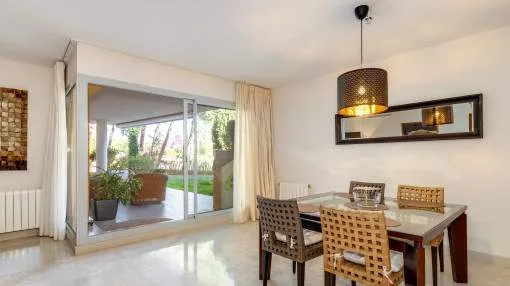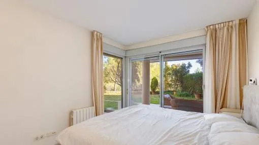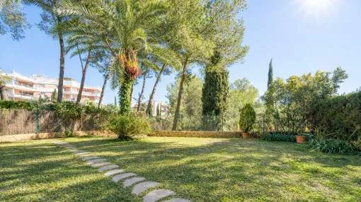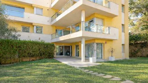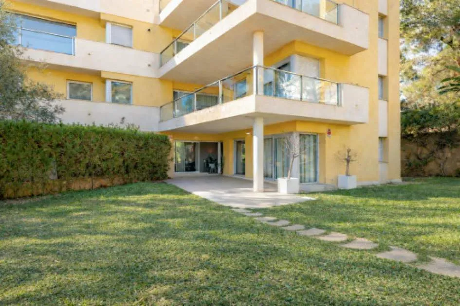Exclusive ground floor apartment with private garden, two parking spaces, and communal pool in Sol de Mallorca