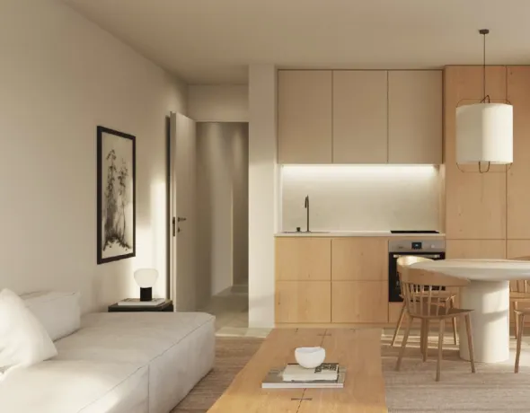 Discover this spectacular apartment located in one of the most sought-after areas of Mallorca, on the seafront in Puerto de Pollensa, where the sea and mountains merge in a unique setting. With a total surface area of 67 m², this property has been designed and completely renovated with top-quality materials and a contemporary style that combines elegance and comfort. The property has two double bedrooms with fitted wardrobes and two full bathrooms, one of which is en suite, both with showers and modern, high-end finishes. The open-plan kitchen blends harmoniously with the living-dining room and balcony, creating an open-plan space with large windows overlooking the mountains and the pool. All rooms are exterior and equipped with double-glazed windows with thermal breaks and sound insulation, ensuring maximum light and tranquillity. The atmosphere is completed by a ducted hot/cold air conditioning system, which ensures maximum comfort throughout the year. The residential complex offers excellent communal areas including a swimming pool, garden, gym, play area, bathroom and lift. In addition, the property has a storage room and the possibility of purchasing parking spaces at an additional cost. With a scheduled completion date of late 2025, this flat represents a unique opportunity to acquire an exclusive, modern and brand new residence in an incomparable natural setting, just a few steps from the sea.