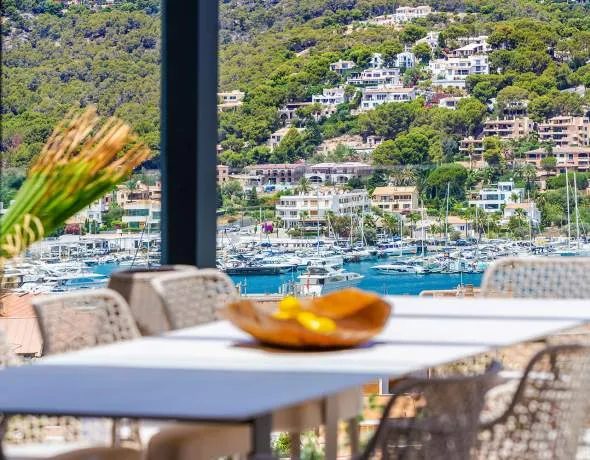This recently completed, modern new-build villa impresses with its location above the picturesque Port Andratx, as well as its fantastic harbour and panoramic views and excellent construction quality. The south-west facing property was built on an elevated plot in a prime residential location, directly adjacent to a green zone. The popular harbour promenade with its numerous cafés, restaurants and boutiques can be reached on foot in just a few minutes. The villa extends over four floors, which are connected by a lift and has its main entrance on the lower floor. The highlight of the villa is the roof terrace with teak flooring, infinity pool, summer lounge, jacuzzi, open and covered terraces and a large garden. The technical equipment with a modern KNX home control system, a heat pump with solar support for hot water and heating or cooling as well as pool heating, thermostatic fittings in the bathrooms and much more meets the highest standards. The villa was furnished and decorated by Espacio Home Design and with artefacts from Galeria HMH.