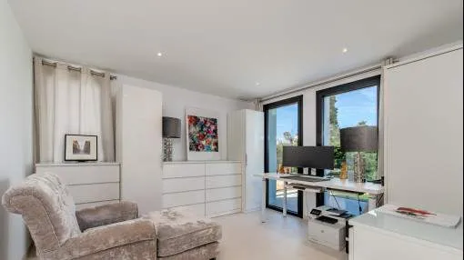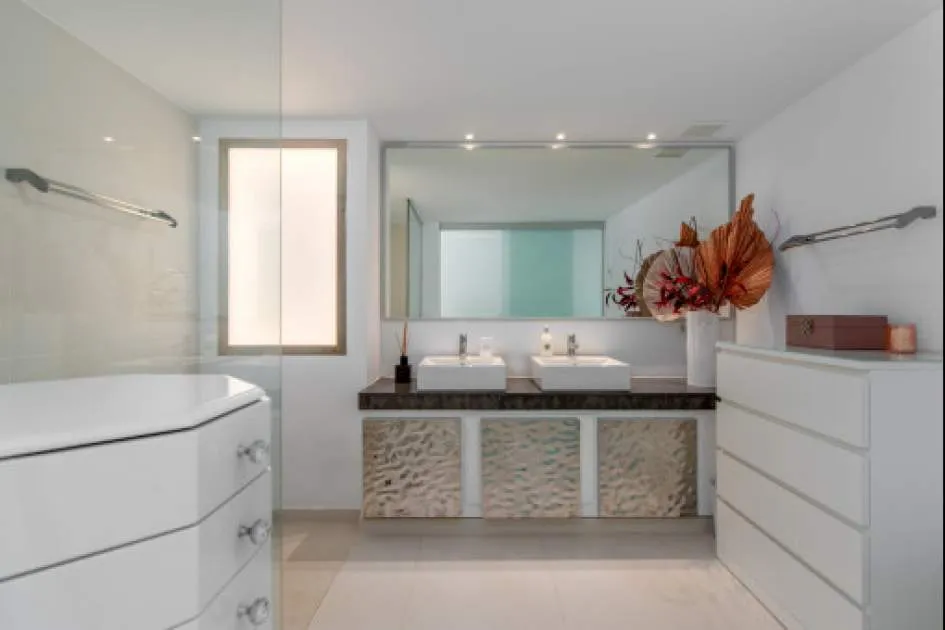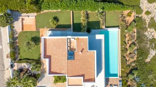 Details: This exclusive villa on the seafront combines modern design and an incomparable location on a Mediterranean plot of approx. 1,228 m². With a construction area of approx. 455 m², it offers a living concept that meets the highest standards. Generous panoramic windows make the Mediterranean Sea the central design element from almost every room and create a unique connection between the interior and exterior. The villa impresses with its light-flooded designer furnishings, clear room structure and high-quality materials. The open-plan living and dining area with integrated kitchen, wine fridge and fireplace forms the heart of the house. A stylish lighting concept and WiFi-controlled underfloor heating ensure maximum living comfort all year round. A living area of approx. 281 m² with a total of six bedrooms and four bathrooms extends over two levels. The upper living level accommodates three bedrooms and two elegantly designed bathrooms, one of which is en suite. From here, you have direct access to the 95 m² sun terrace, which invites you to relax and enjoy the fantastic sea views. The lower level offers three further bedrooms and two bathrooms - ideal for family and guests. Several bedrooms have sea views and direct access to the terraces, so that every morning begins with a view of the Mediterranean. The outdoor area presents itself as a private oasis of well-being with a 15-metre heated pool, several sun terraces and a fitness room. Up to four parking spaces are available. The villa is fully air-conditioned, energy-efficiently equipped (heat pump, solar system, exterior insulation) and is offered fully furnished. An exceptional property for buyers seeking tranquillity, privacy and spectacular views in one of Mallorca's most sought-after locations. Experience life by the sea at the highest level - this villa offers you a home of rare quality. Returns from holiday lettings: For initial orientation you can use the “Porta Holiday Returns Calculator” without obligation to calculate your potential returns from holiday letting. NB: Due to the current legal situation it is possible that in certain municipalities renting restrictions may apply, or new touristic licences may not be granted. Your Porta Mallorquina real estate consultant will be pleased to advise you whether the property you have chosen is affected. Go to Returns Calculator. Location & surrounding area: Cala Murada is located on the east coast between Portocolom and Calas de Mallorca. The beautiful holiday village mainly consists of villas and chalets, which are set on green hills around the nice sandy bay. It offers a good infrastructure with restaurants and shops for the daily needs. Portocolom and Porto Cristo are a short drive away as well as the golf course of Vall d’Or.