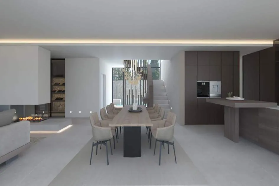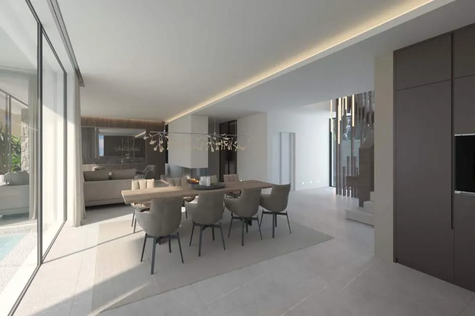 The spacious project for a high-end villa features 553 m² of living space and includes a large living/dining area with an open-plan kitchen and a wine cellar. There are also five bedrooms, four bathrooms, and an outdoor area with an infinity pool, a covered barbecue area, and sun terraces. The lower floor will house a garage for three vehicles and a fitness area with a sauna and spa.