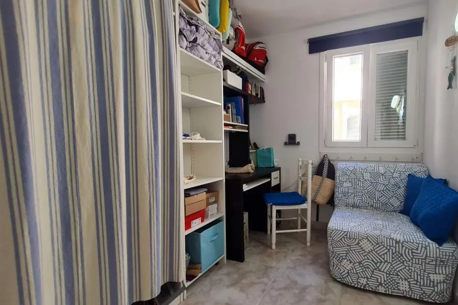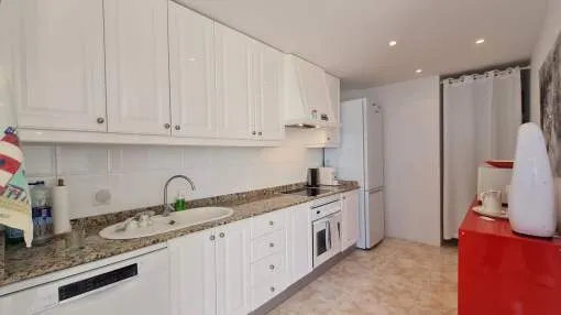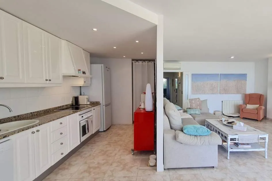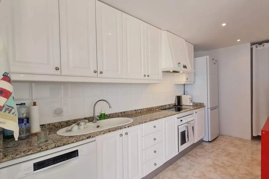 The property offers approximately 114 m² of living space, distributed into three bedrooms (two doubles and one single), two full bathrooms – one en suite – and a spacious living-dining area seamlessly connected to a fully equipped kitchen. There is also a practical utility room with everything needed for daily life.