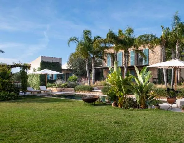 The natural stone façade, built using traditional Mallorcan craftsmanship, gives the estate a distinctive aesthetic.