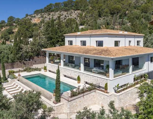 This stylish, refurbished villa is situated in an elevated, peaceful location at the foot of the Tramuntana mountains near Bunyola, offering spectacular panoramic views over the Bay of Palma and the mountains. Despite the idyllic tranquillity, it has excellent access to Palma as well as the charming towns of Valldemossa and Sóller. The exclusive residential area of Sa Font Seca, part of the UNESCO World Heritage Site, is known for its privacy, nature, and luxurious real estate. The surrounding area offers numerous leisure activities such as horse riding and cycling trails, golf courses, including the Son Termes Golf Club just around the corner. International schools are within approximately 20 minutes.