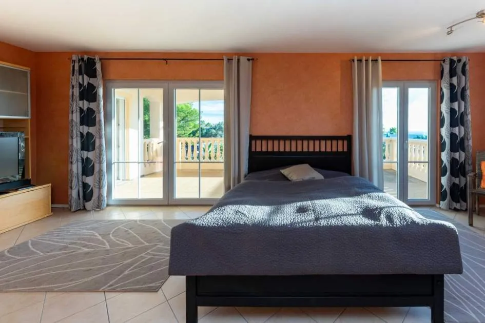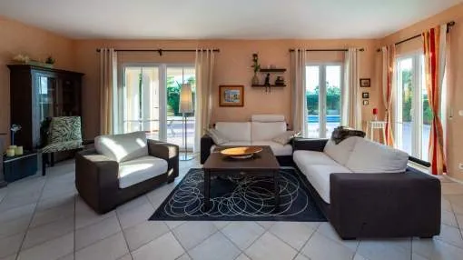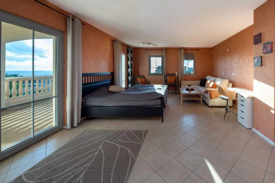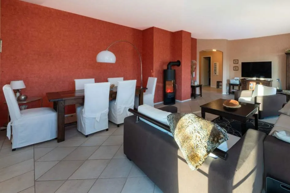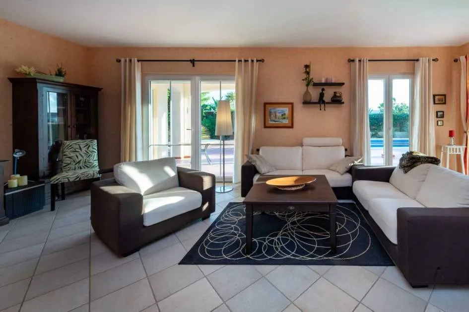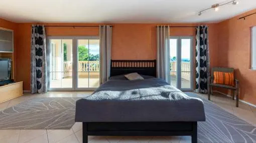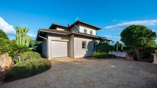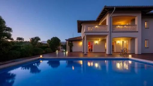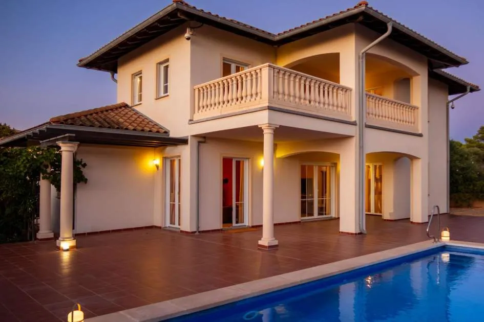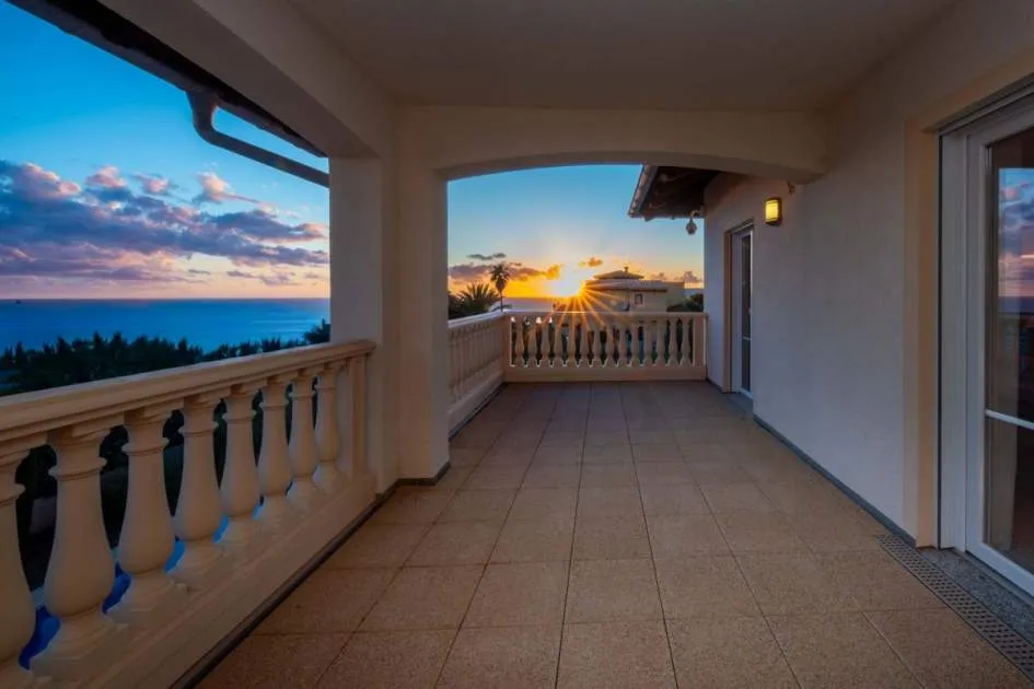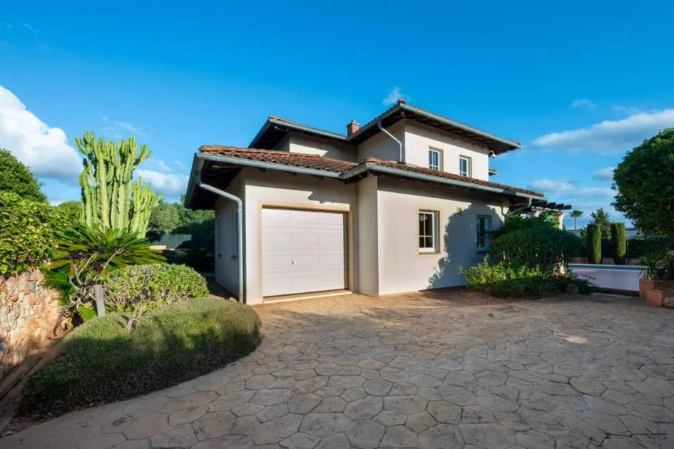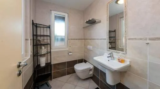 The villa impresses with excellent insulation, spacious terraces, a large basement area, and beautiful sea views. Situated on a plot of approximately 734 m², the built area of around 413 m² is spread over three levels, thoughtfully designed to create bright, sunlit rooms and a seamless connection between indoor and outdoor living spaces. On the ground floor, a hallway leads to an open living room seamlessly connected to the dining area and modern kitchen. Large windows open onto the pool area, flooding the interior with natural light. This level also includes a bedroom with a dressing area, a generous bathroom with shower, and a guest toilet. A wooden staircase leads to the upper floor, which features two additional bedrooms and a bathroom. A spacious, bright living area provides access to a large terrace with sea views – this area can also be used as a separate apartment, perfect for guests or extended stays. The lower level offers several generous rooms that can be used flexibly – ideal for hobby rooms, a gym, or a home office. The outdoor area features a large terrace with a pool and well-maintained Mediterranean gardens, inviting relaxation and enjoyment with family and friends. Whether as a permanent residence or a second home, this villa offers a privileged Mediterranean lifestyle, designed to make the most of the island’s charm.