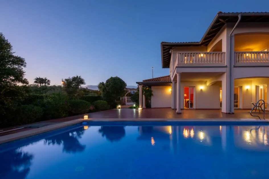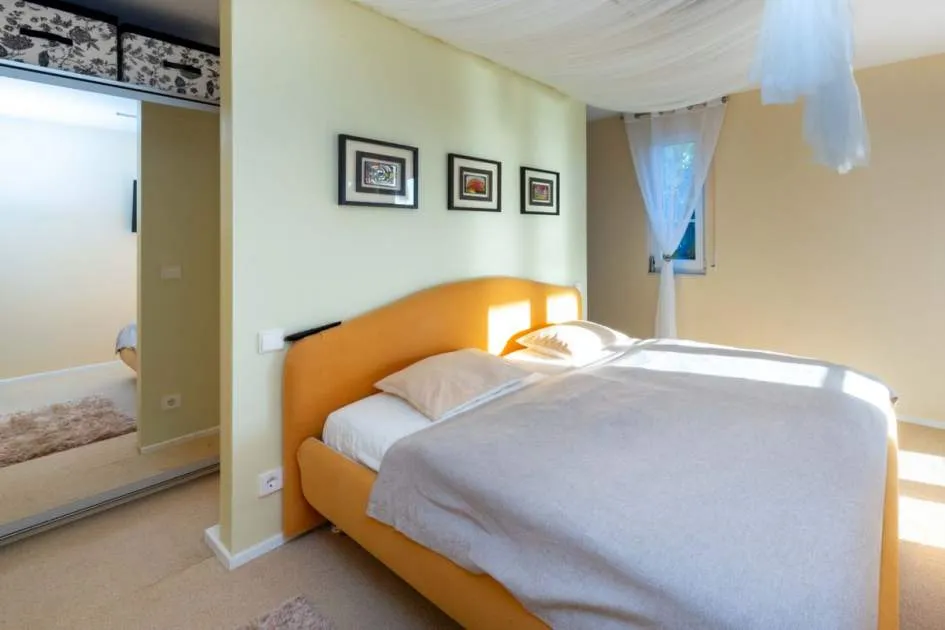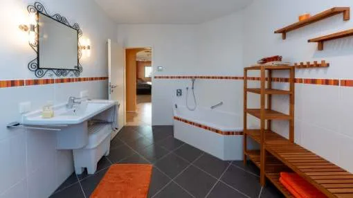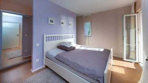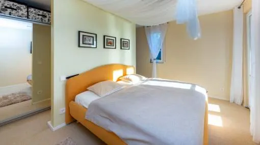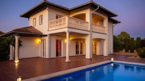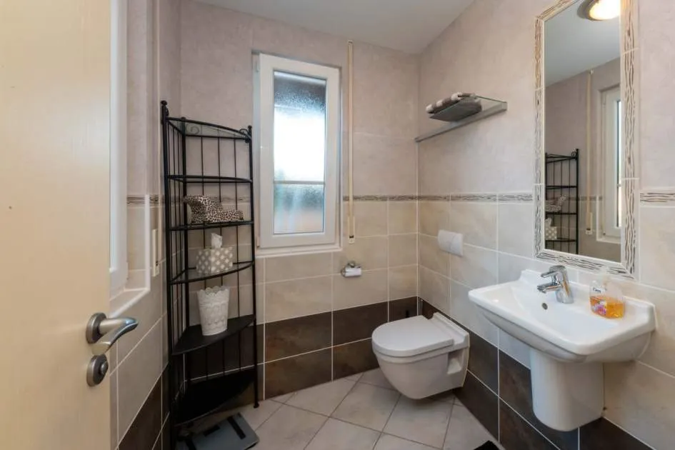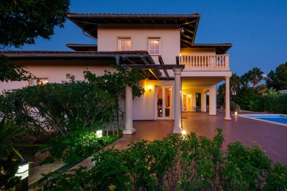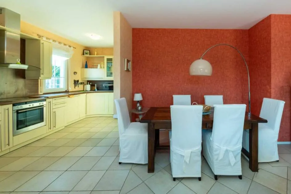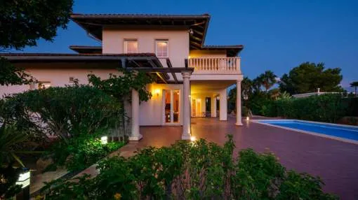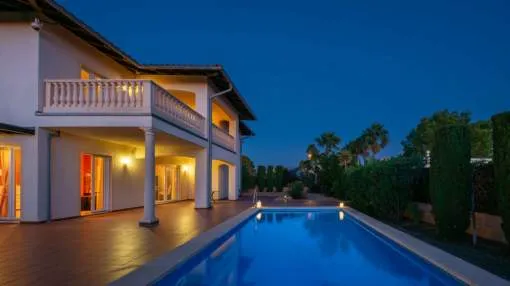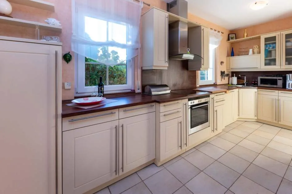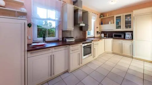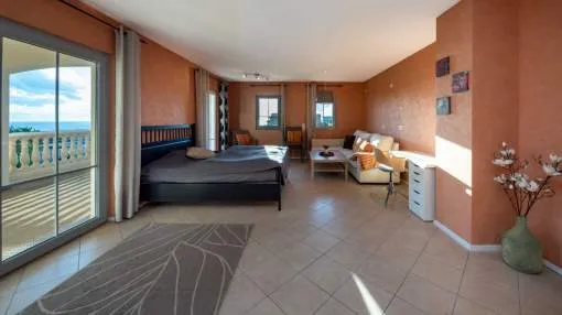The villa impresses with excellent insulation, spacious terraces, a large basement area, and beautiful sea views. Situated on a plot of approximately 734 m², the built area of around 413 m² is spread over three levels, thoughtfully designed to create bright, sunlit rooms and a seamless connection between indoor and outdoor living spaces. On the ground floor, a hallway leads to an open living room seamlessly connected to the dining area and modern kitchen. Large windows open onto the pool area, flooding the interior with natural light. This level also includes a bedroom with a dressing area, a generous bathroom with shower, and a guest toilet. A wooden staircase leads to the upper floor, which features two additional bedrooms and a bathroom. A spacious, bright living area provides access to a large terrace with sea views – this area can also be used as a separate apartment, perfect for guests or extended stays. The lower level offers several generous rooms that can be used flexibly – ideal for hobby rooms, a gym, or a home office. The outdoor area features a large terrace with a pool and well-maintained Mediterranean gardens, inviting relaxation and enjoyment with family and friends. Whether as a permanent residence or a second home, this villa offers a privileged Mediterranean lifestyle, designed to make the most of the island’s charm.