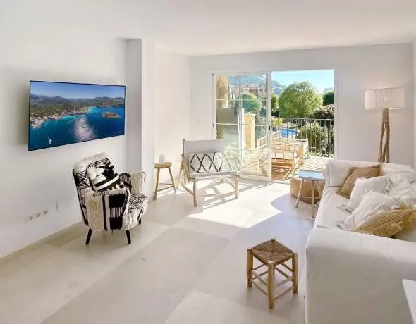 In a sought-after area of Puerto de Andratx, this extensively refurbished apartment presents itself as an ideal combination of modern comfort and Mediterranean lifestyle. The property is situated on the first floor of a well-maintained residential complex with only 21 units, distributed across five buildings, and impresses with its tranquil yet central location. Both the elegant harbour promenade and the renowned Club de Vela Puerto de Andratx can be comfortably reached in approximately ten minutes on foot.