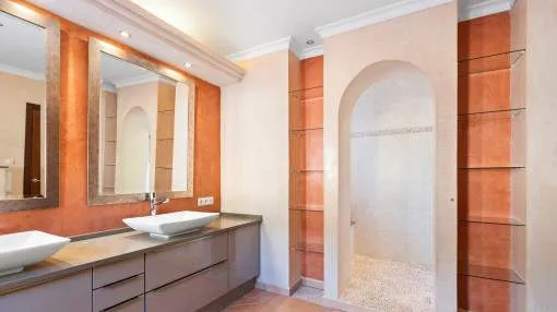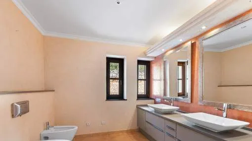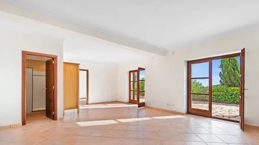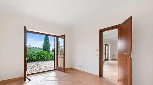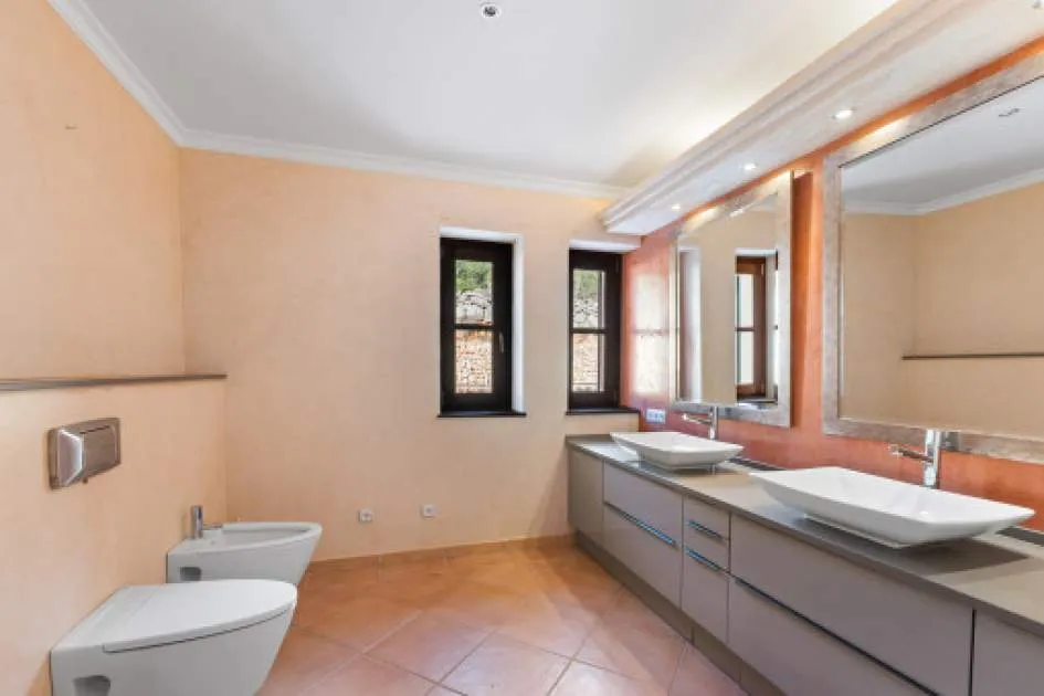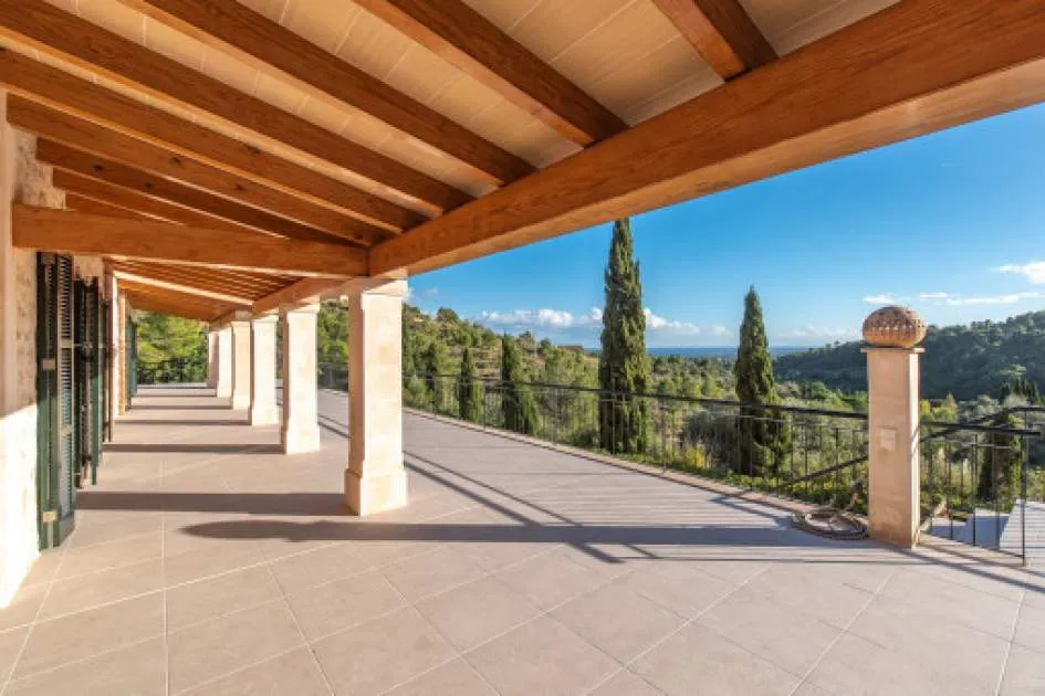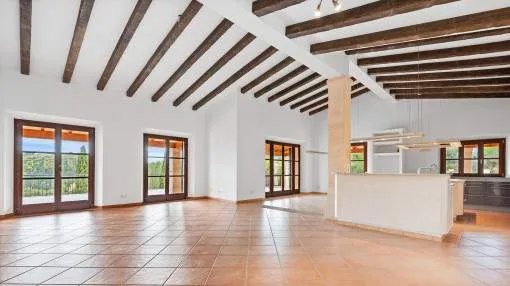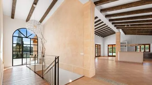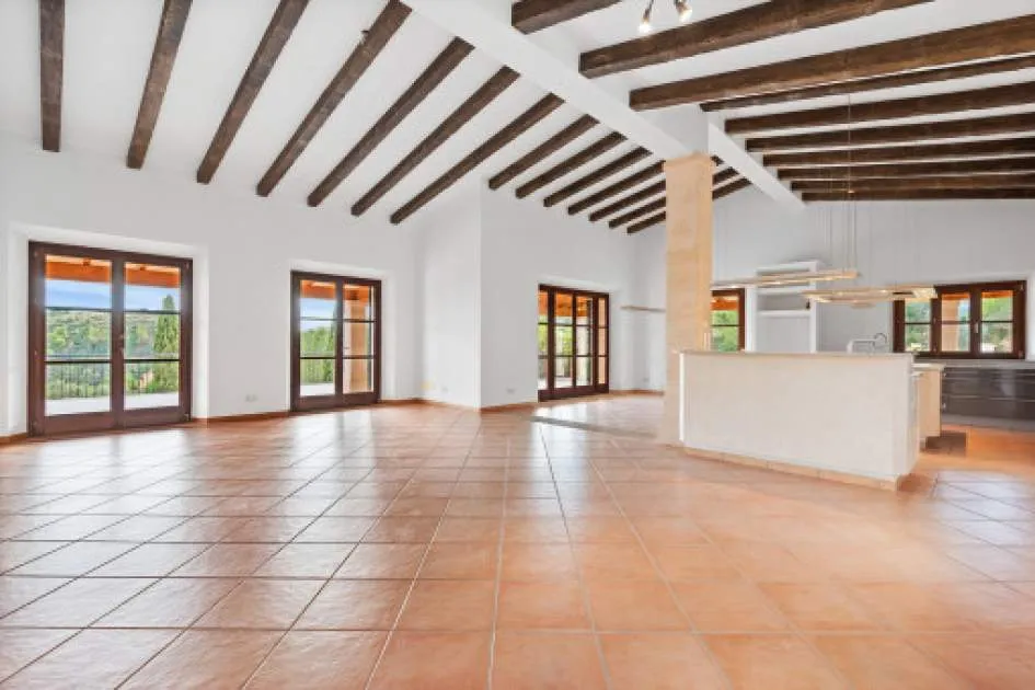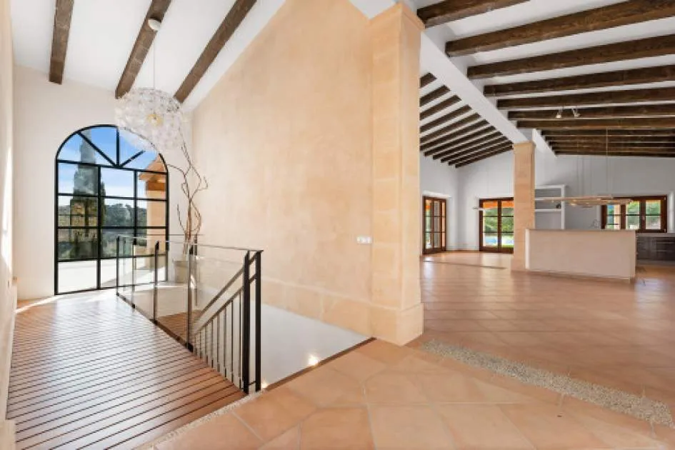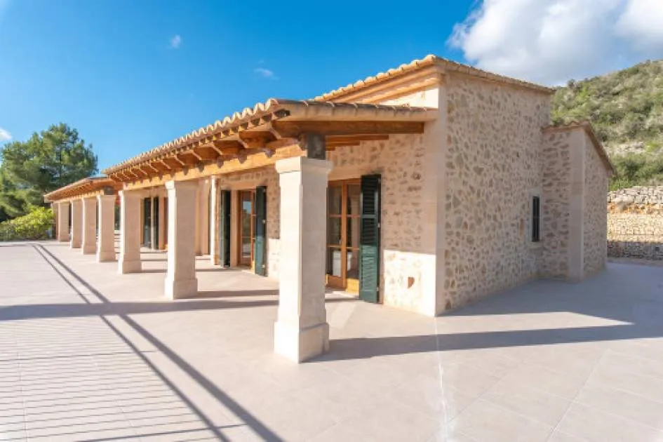 Details: This breathtaking finca, idyllically situated on a slightly elevated plot near the picturesque village of Son Macià, offers you an incomparable level of peace and privacy. Surrounded by the magnificent Mediterranean landscape, you can enjoy fantastic panoramic views of the majestic mountains and the vast sea. An impressive driveway leads to this luxurious finca, whose spacious entrance area leads into an open, light-flooded living and dining area. A modern kitchen, which is complemented by a large, tiled food storage room and a "mise en place", as well as a cozy fireplace create a perfect combination of functionality and comfort. The high ceilings with exposed wooden beams give the rooms a typical Mallorcan flair. From the living area you enter a covered terrace that offers spectacular views of the sea and the Calas de Mallorca. The elegant master bedroom has a spacious dressing area and a stylish en suite bathroom. A further bedroom and a separate guest WC complete this floor. In the lower area of the finca you will find 2 guest areas with a total of 4 bedrooms and 3 complete bathrooms. All bedrooms have direct access to the terrace, and an exclusive wellness area with sauna provides additional comfort. The outdoor area of this property with a pool, from which you have a fantastic view of the sea and the surrounding Mediterranean vegetation, forms the heart of the garden. The separate, covered barbecue area is the perfect setting for socializing with family and friends. The property is equipped with air conditioning and underfloor heating for year-round comfort. A spacious garage offers ample space for your vehicles. Returns from holiday lettings: For initial orientation you can use the “Porta Holiday Returns Calculator” without obligation to calculate your potential returns from holiday letting. NB: Due to the current legal situation it is possible that in certain municipalities renting restrictions may apply, or new touristic licences may not be granted. Your Porta Mallorquina real estate consultant will be pleased to advise you whether the property you have chosen is affected. Go to Returns Calculator. Location & surrounding area: Son Macià is a pretty finca area, very rural and original. It is situated between Manacor, Porto Cristo and Felantix in the centre of the island, a few km away from the beaches of Calas de Mallorca.