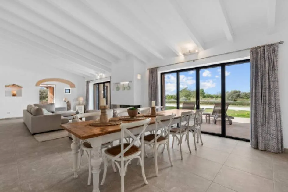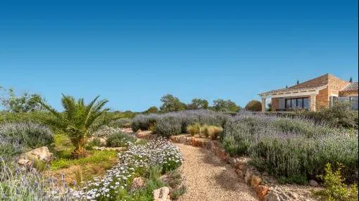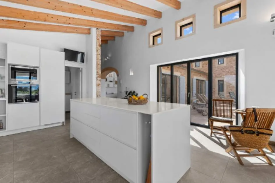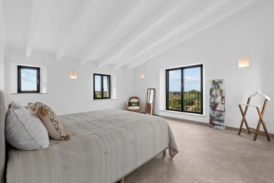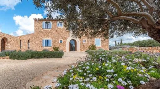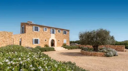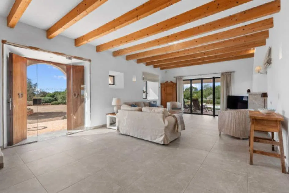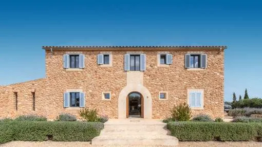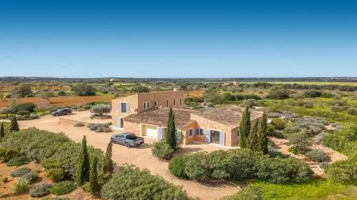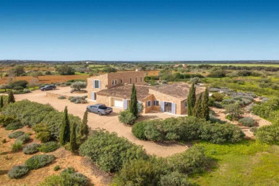Details: This enchanting natural stone finca is set on a spacious plot of approx. 14,200 sqm and combines Mediterranean charm with modern living comfort. Surrounded by unspoiled nature, you can enjoy breathtaking 360-degree panoramic views thanks to the floor-to-ceiling windows - a place where peace and space are palpable. The idyllic village of Ses Salines is just a few minutes away. On the first floor, you are welcomed by a spacious, light-flooded living area with a fireplace, which provides cozy warmth on cooler evenings. The open, modern kitchen blends harmoniously into the adjoining dining area. Several exits lead out onto lovingly designed terraces with cozy seating areas. Here you can enjoy spectacular sunsets in the evening. Two comfortable bedrooms, each with its own bathroom, round off this floor. The stylish master bedroom with en suite bathroom, dressing area and magnificent views of the sea and Cabrera awaits you on the upper floor. A further bedroom with its own bathroom completes the space on this level. The Mediterranean-style, low-maintenance garden invites you to linger. The 20-metre-long pool and the separate covered barbecue area with fireplace are a real highlight. The offer is rounded off by a spacious garage for 2 vehicles with direct access to the house as well as underfloor heating, which ensures a pleasant living atmosphere even in the cooler months of the year. Returns from holiday lettings: For initial orientation you can use the “Porta Holiday Returns Calculator” without obligation to calculate your potential returns from holiday letting. NB: Due to the current legal situation it is possible that in certain municipalities renting restrictions may apply, or new touristic licences may not be granted. Your Porta Mallorquina real estate consultant will be pleased to advise you whether the property you have chosen is affected. Go to Returns Calculator. Location & surrounding area: Ses Salines is one of the nicest and oldest villages at the southeast coast. The image of the village is characterised by cosy bars and restaurants, where Majorcans and tourists have their “café con leche” while enjoying the sun. It is a typical Majorcan village that was named after its saline from the era of the Romans. Salt is reaped till this day. The “talaiots”, remains of a prehistoric settlement are also historically very interesting. Many small bays as Cala Llombards or the dreamlike natural beach of Es Trenc is only a short drive away. You can also discover the beautiful flat landscape by bicycle.