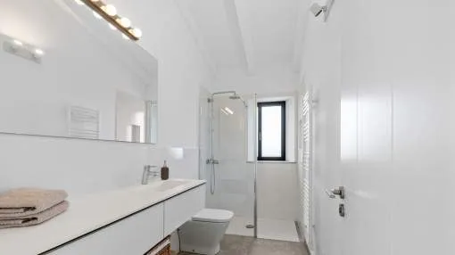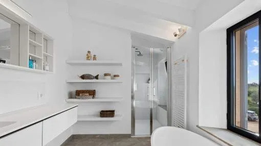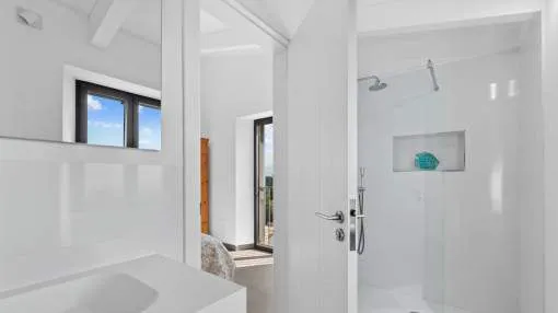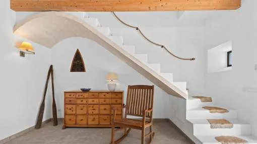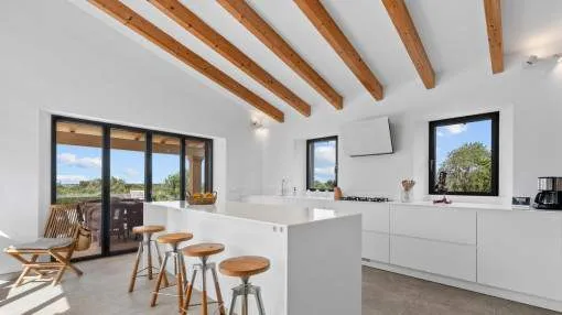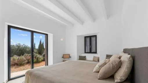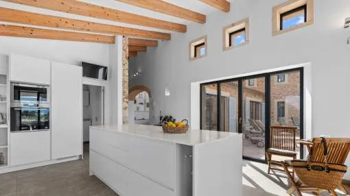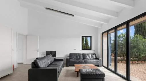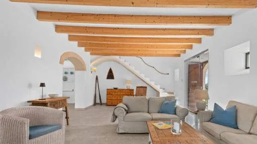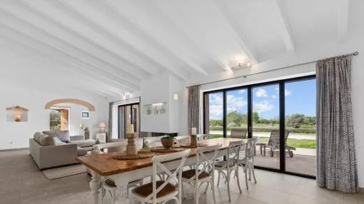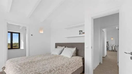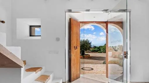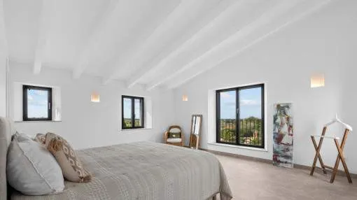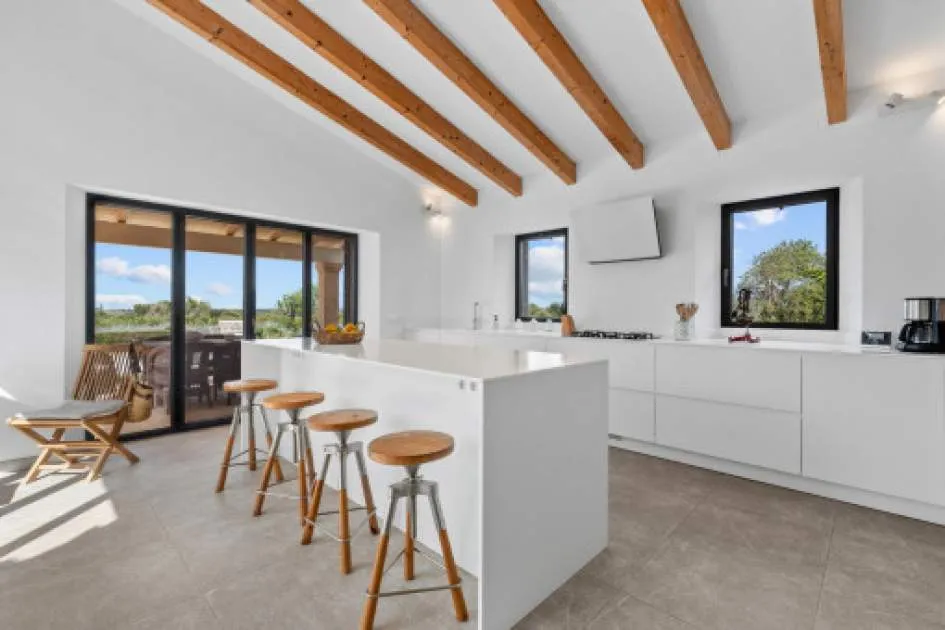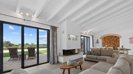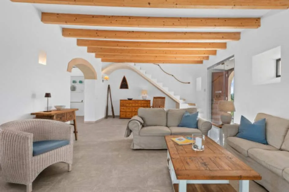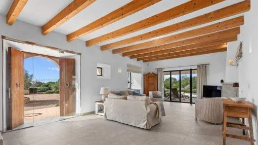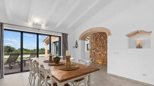 Details: This enchanting natural stone finca is set on a spacious plot of approx. 14,200 sqm and combines Mediterranean charm with modern living comfort. Surrounded by unspoiled nature, you can enjoy breathtaking 360-degree panoramic views thanks to the floor-to-ceiling windows - a place where peace and space are palpable. The idyllic village of Ses Salines is just a few minutes away. On the first floor, you are welcomed by a spacious, light-flooded living area with a fireplace, which provides cozy warmth on cooler evenings. The open, modern kitchen blends harmoniously into the adjoining dining area. Several exits lead out onto lovingly designed terraces with cozy seating areas. Here you can enjoy spectacular sunsets in the evening. Two comfortable bedrooms, each with its own bathroom, round off this floor. The stylish master bedroom with en suite bathroom, dressing area and magnificent views of the sea and Cabrera awaits you on the upper floor. A further bedroom with its own bathroom completes the space on this level. The Mediterranean-style, low-maintenance garden invites you to linger. The 20-metre-long pool and the separate covered barbecue area with fireplace are a real highlight. The offer is rounded off by a spacious garage for 2 vehicles with direct access to the house as well as underfloor heating, which ensures a pleasant living atmosphere even in the cooler months of the year. Returns from holiday lettings: For initial orientation you can use the “Porta Holiday Returns Calculator” without obligation to calculate your potential returns from holiday letting. NB: Due to the current legal situation it is possible that in certain municipalities renting restrictions may apply, or new touristic licences may not be granted. Your Porta Mallorquina real estate consultant will be pleased to advise you whether the property you have chosen is affected. Go to Returns Calculator. Location & surrounding area: Ses Salines is one of the nicest and oldest villages at the southeast coast. The image of the village is characterised by cosy bars and restaurants, where Majorcans and tourists have their “café con leche” while enjoying the sun. It is a typical Majorcan village that was named after its saline from the era of the Romans. Salt is reaped till this day. The “talaiots”, remains of a prehistoric settlement are also historically very interesting. Many small bays as Cala Llombards or the dreamlike natural beach of Es Trenc is only a short drive away. You can also discover the beautiful flat landscape by bicycle.