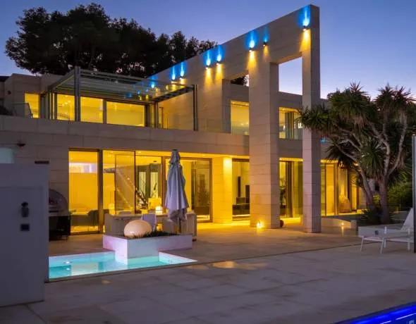 This futuristic villa, with a constructed area of 880 m², was built in 2013 on a 1,980 m² plot in Sol de Mallorca. The property boasts direct beach access and partial sea views from the terrace. The house features five double bedrooms, seven bathrooms (some en suite), a fully equipped kitchen (plus a utility kitchen) with an adjoining dining area, and a spacious, two-story living room with a fireplace. Future owners can also enjoy relaxing days in the sauna, jacuzzi, outdoor swimming pool, or steam room. The large, very private garden with an outdoor kitchen and spacious terrace offers ample opportunity to fully enjoy this magnificent property.