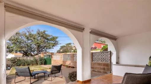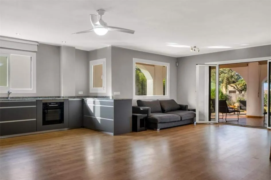The property has a spacious living-dining room with a fully furnished open-plan kitchen, bright and functional, with direct access to a porch and a large private garden, perfect for enjoying the Mediterranean climate all year round.