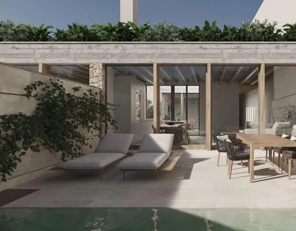 The ground floor features a master bedroom with en-suite bathroom, an open-plan kitchen flowing into the living and dining area, and direct access to the terrace and private pool, perfect for relaxing or entertaining.