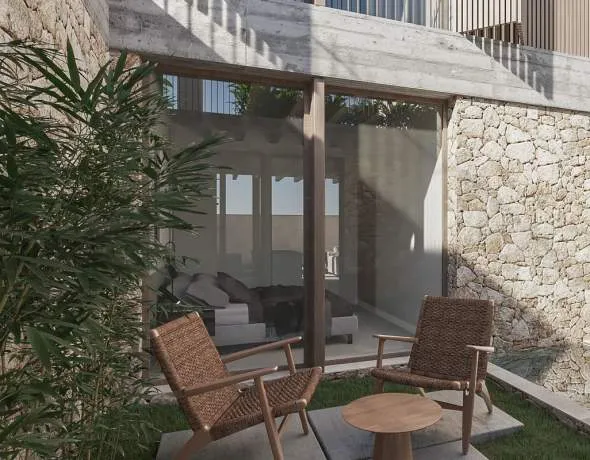 The ground floor features a master bedroom with en-suite bathroom, an open-plan kitchen flowing into the living and dining area, and direct access to the terrace and private pool, perfect for relaxing or entertaining.