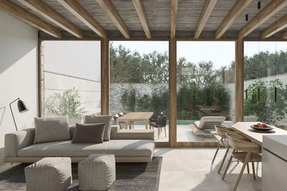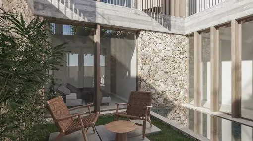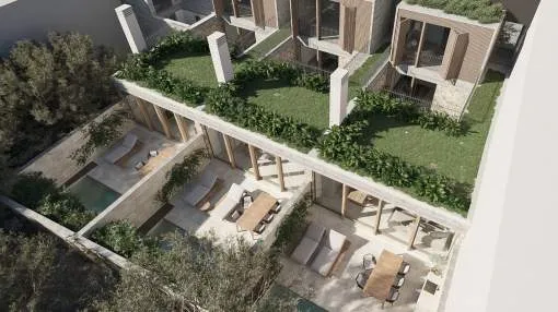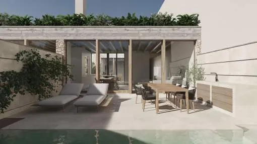 This high-quality new development, consisting of a total of four modern townhouses, is being built in a well-connected location, close to a park, in Son Espanyolet. At the center of attention is the corner house, which offers a built area of approximately 185 m², including a basement of around 72 m². On the ground floor, there is the master bedroom with en-suite bathroom, an open-plan kitchen with living and dining area, and direct access to the terrace and private pool area. On the first floor, there are two additional bedrooms and a shared bathroom. From here, you can access the roof terrace, providing extra outdoor space and beautiful views. The basement includes an additional bathroom, a technical room, a laundry room, a storage room, and a multi-functional room that can be used flexibly – for example as a gym or home cinema. The house is distinguished by exceptional natural light, thanks to two internal patios that illuminate all levels, creating a bright and welcoming living atmosphere. A private parking space in front of the house completes this attractive property.